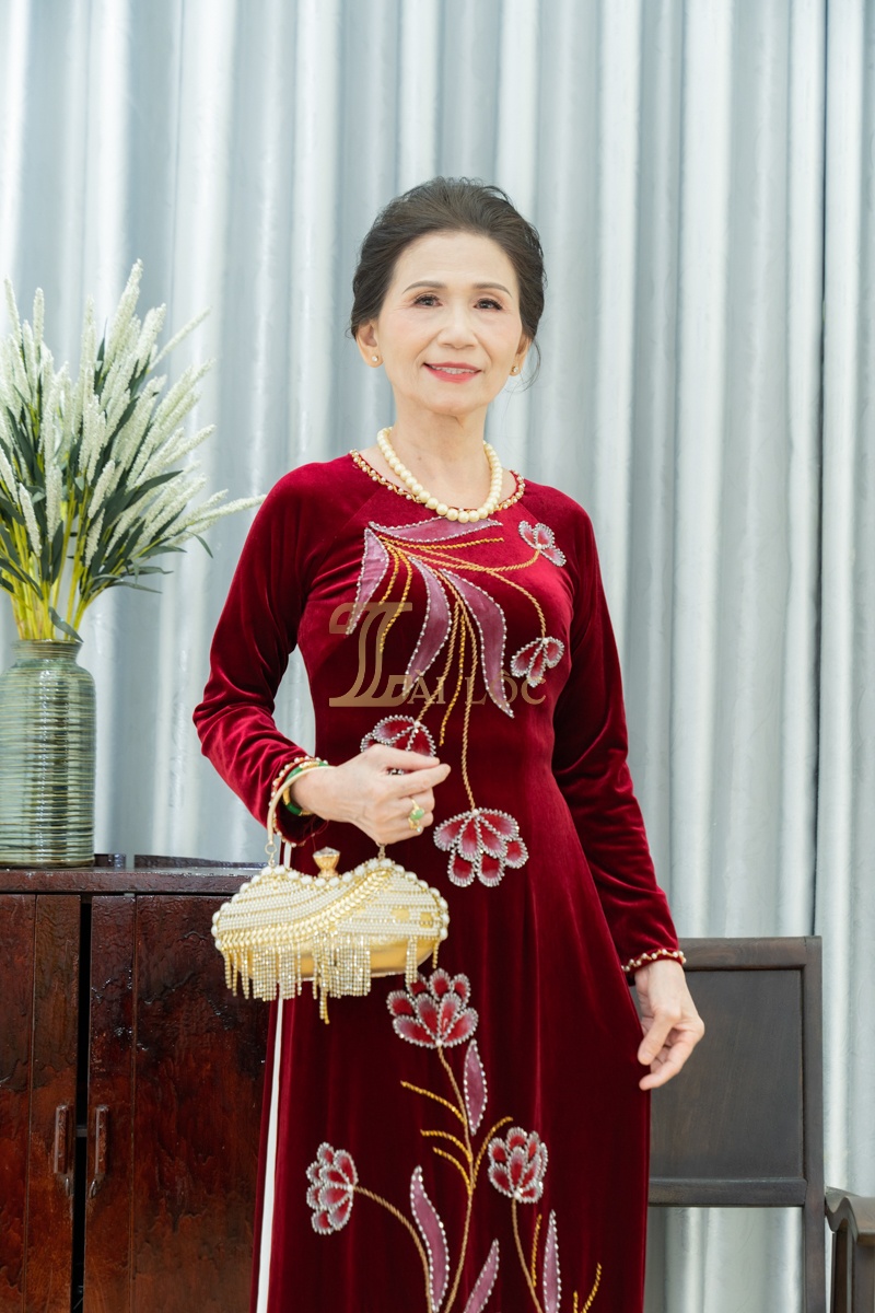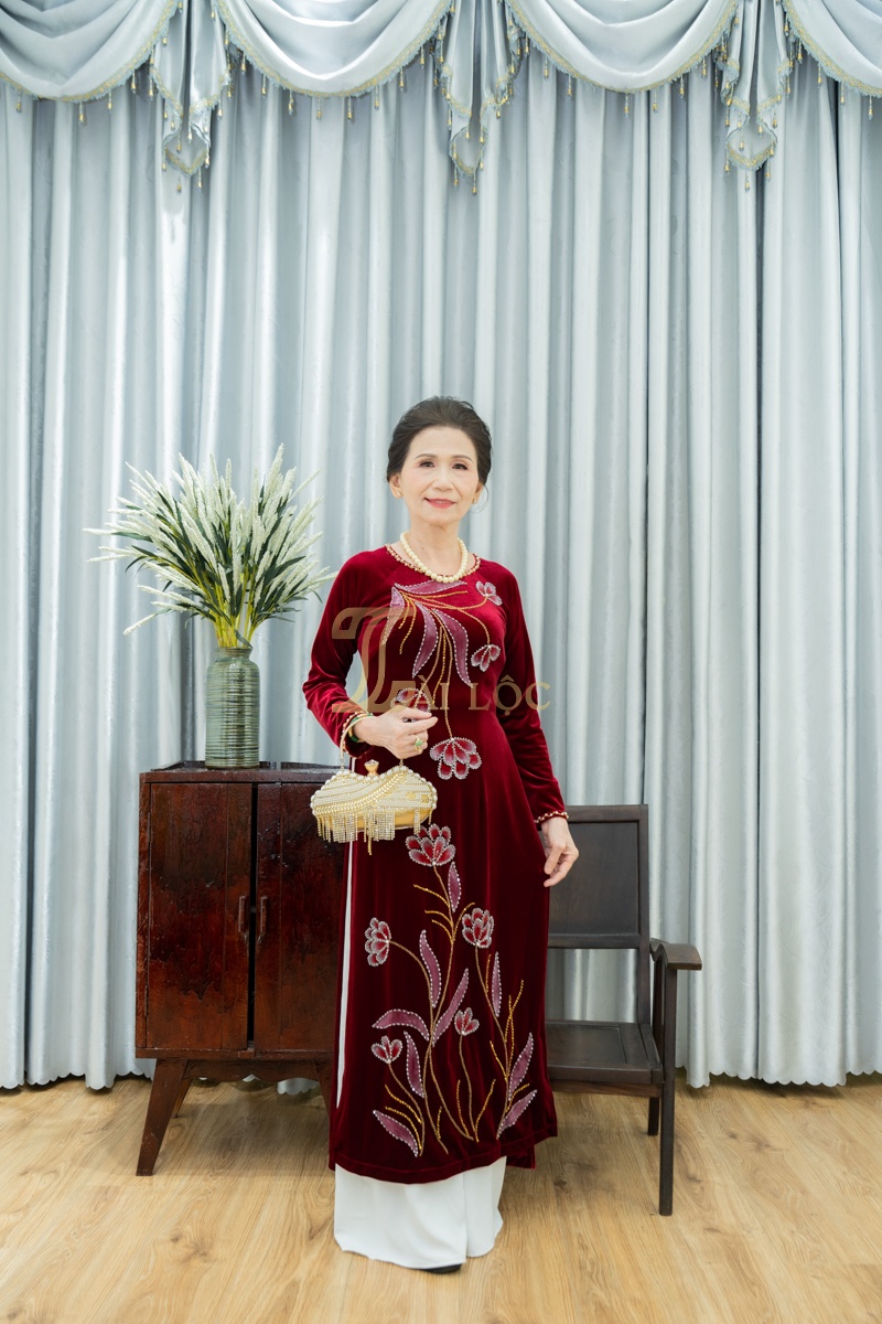 Áo dài này có màu đỏ đô – một sắc màu không chỉ thể hiện sự may mắn, ấm áp mà còn biểu trưng cho tình yêu, sự gắn kết và niềm hạnh phúc viên mãn. Điểm nhấn nổi bật của chiếc áo là họa tiết cườm kết bông được thêu tinh xảo trải dọc từ phần tà áo lên đến trước ngực. Mỗi đường cườm, mỗi bông hoa đều được đính kết cẩn thận, làm nổi bật trên nền nhung đỏ như những ngôi sao lung linh trong đêm, tạo nên sự lấp lánh nhưng vẫn giữ được vẻ thanh lịch. Chiếc áo được làm từ chất liệu nhung cao cấp, mang lại sự mềm mại, thoải mái nhưng vẫn ôm vừa vặn để tôn lên vóc dáng người mặc.