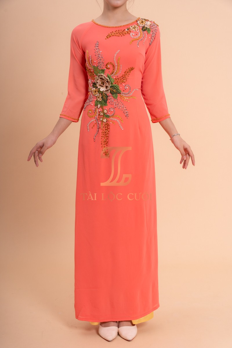 Áo Dài Bà Sui Cam Lụa Đính Cườm Dọc Tà Sang Trọng XL-BSVL10