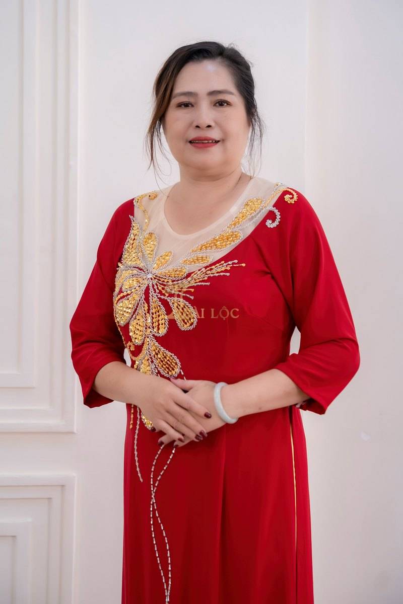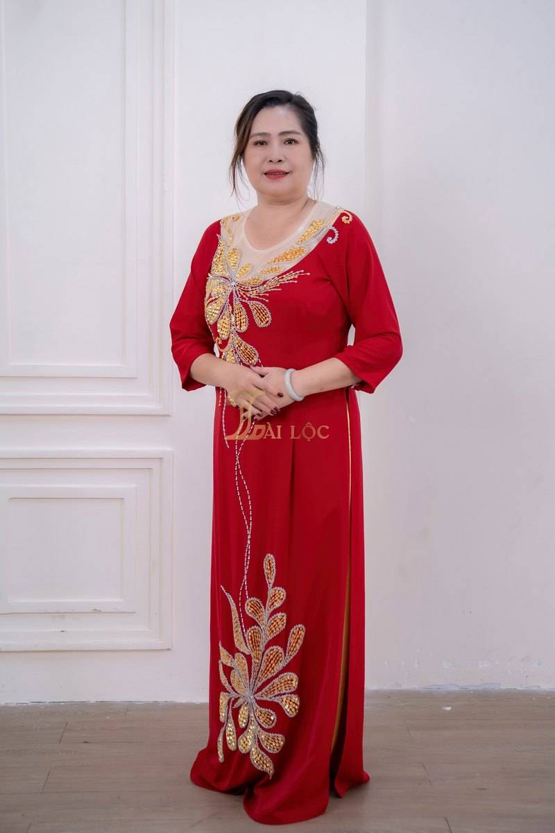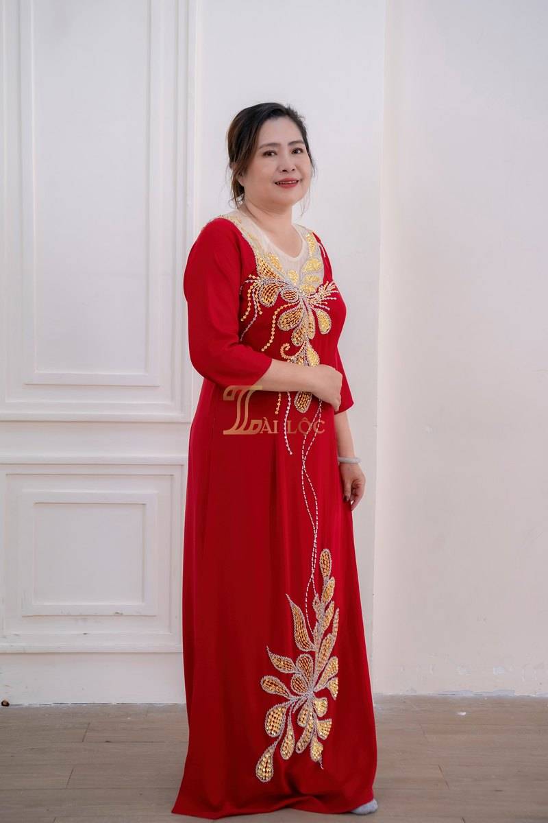 Chất liệu lụa cao cấp mang lại cảm giác thoải mái, mềm mại và thoáng mát khi mặc. Áo dài được làm từ lụa cao cấp, đảm bảo độ bền và sang trọng. Màu đỏ biểu tượng sự may mắn, thịnh vượng và quyền lực. Áo dài bà sui màu đỏ là sự lựa chọn hoàn hảo cho các dịp đặc biệt như đám cưới, lễ tết hay các sự kiện quan trọng. Điểm nhấn của chiếc áo dài là họa tiết hoa lá được đính cườm tinh xảo, tạo nên vẻ đẹp lộng lẫy và sang trọng. Các hạt cườm được kết hợp hài hòa, tạo nên một bức tranh sống động trên nền lụa đỏ.
