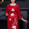 - Áo Dài Bà Sui Vải Lụa Đỏ Cổ Ren Kết Cườm BSĐ112