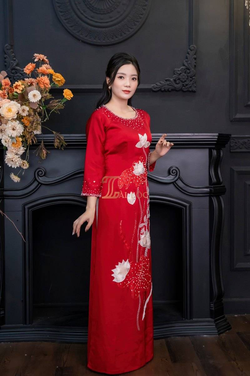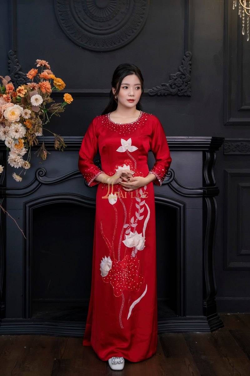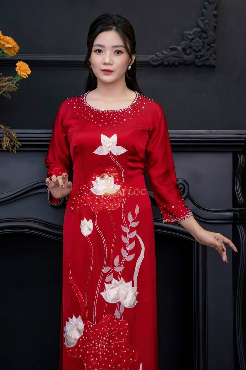 Từng hạt cườm được kết tỉ mỉ quanh cổ và tay áo, tạo nên điểm nhấn sang trọng và tinh tế. Điểm nhấn của chiếc áo dài là những bông sen trắng tinh khôi được kết cườm tỉ mỉ, tạo nên vẻ đẹp lộng lẫy và tinh tế. Lá sen kết cườm trắng nền đỏ tươi tạo nên sự hài hòa và cân đối cho tổng thể chiếc áo dài.