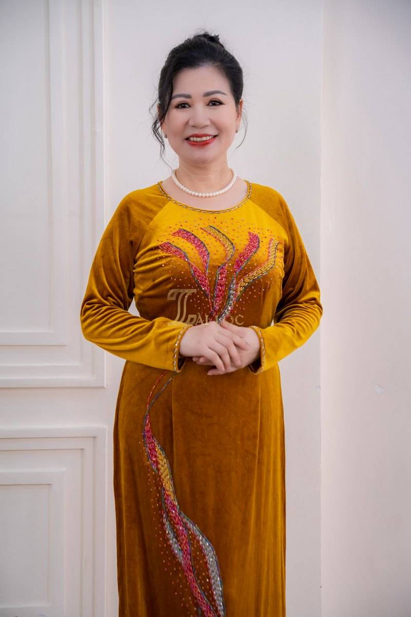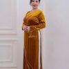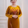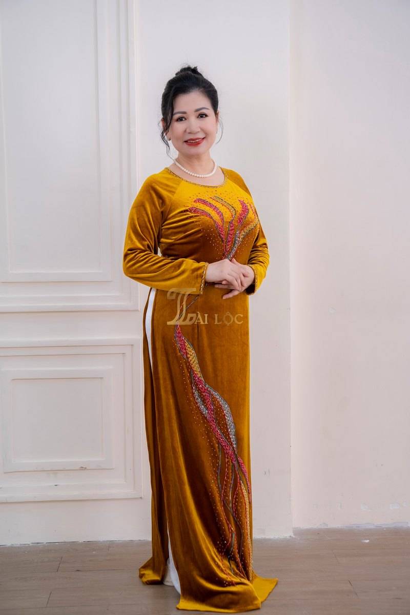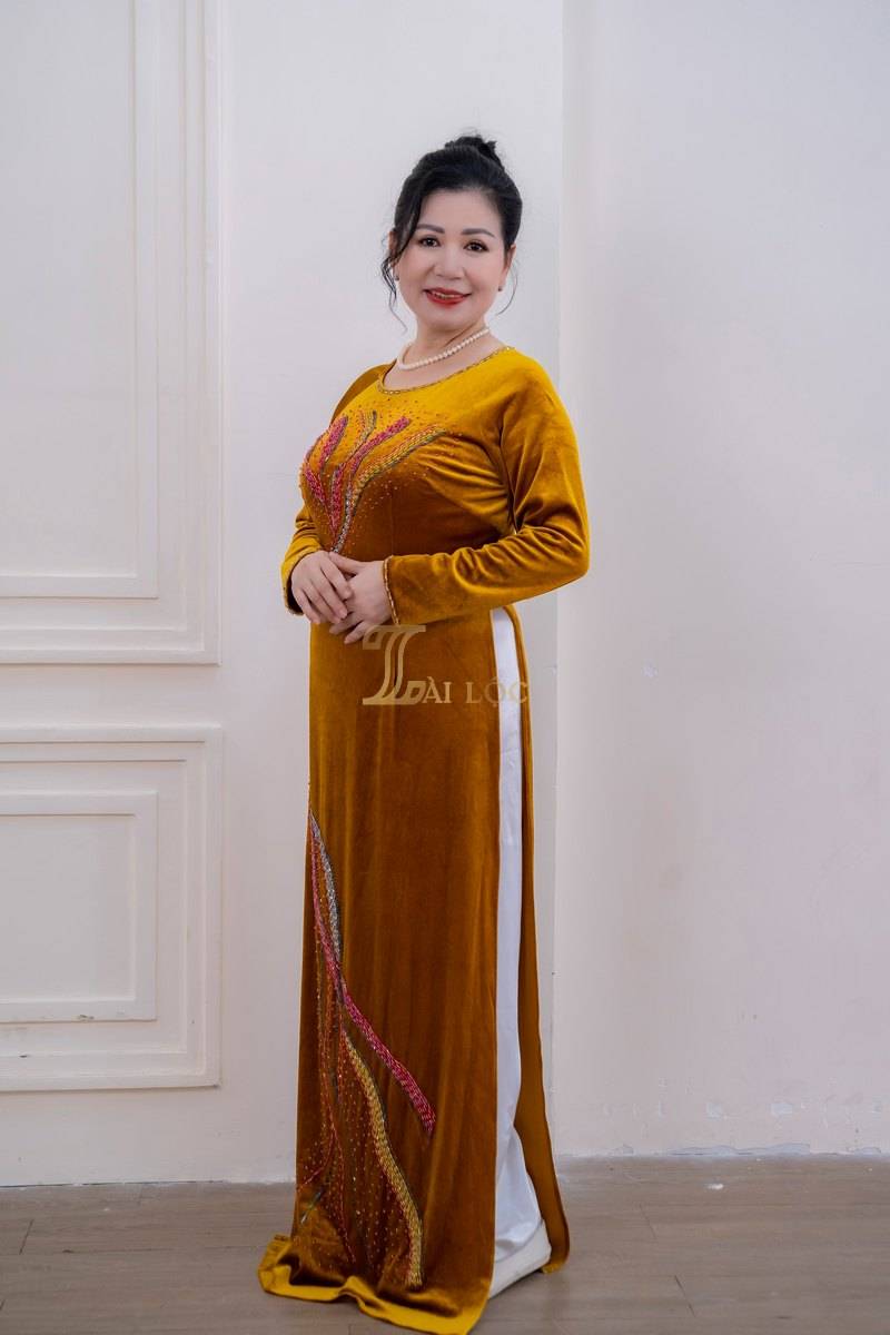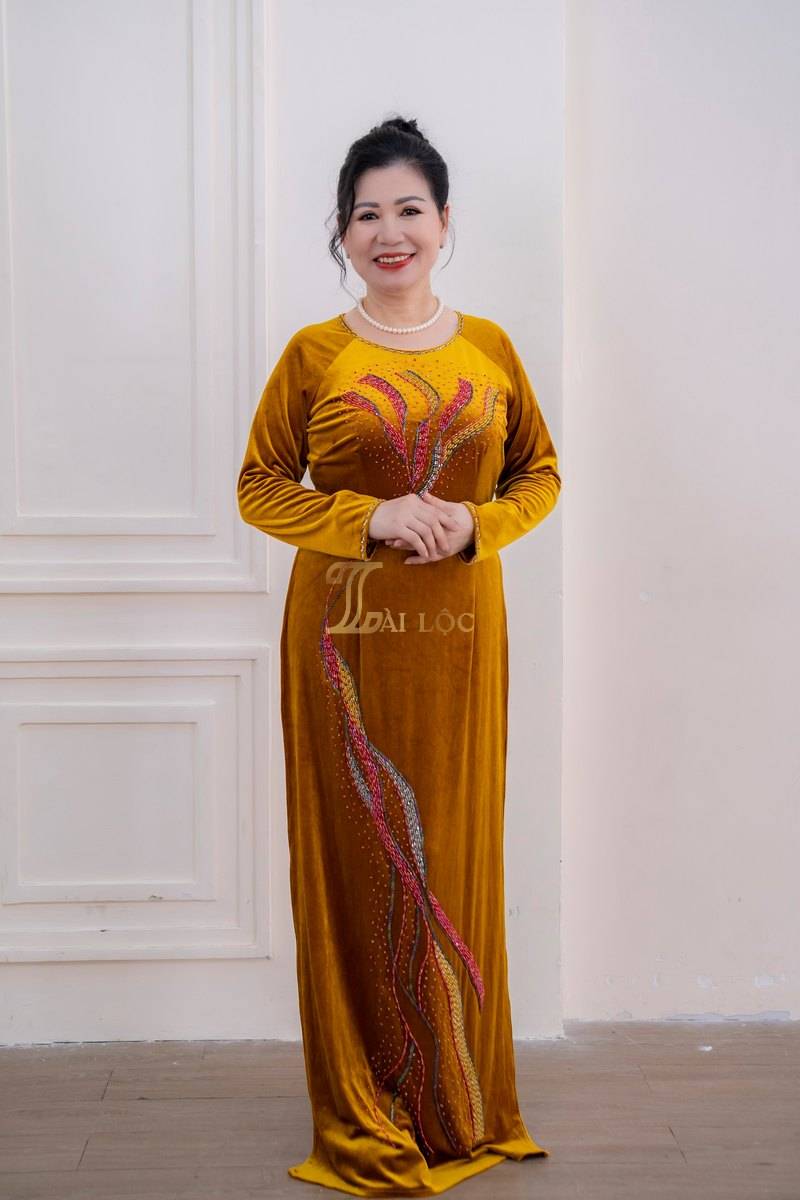 Áo dài bà sui với kiểu dáng truyền thống, tay dài, tôn vinh vẻ đẹp quý phái, sang trọng của người phụ nữ Việt Nam. Vải nhung mềm mại, ấm áp, tạo cảm giác thoải mái khi mặc. Màu nâu đất trầm ấm, tạo nên vẻ đẹp cuốn hút. Kết cườm và đính đá tỉ mỉ, tạo điểm nhấn độc đáo cho chiếc áo dài.