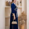 Điểm nhấn của chiếc áo dài là những hạt cườm được đính tỉ mỉ, tạo nên họa tiết hoa lá tinh xảo. Sự kết hợp giữa màu xanh biển và những hạt cườm sáng lấp lánh tạo nên một tổng thể hài hòa và sang trọng.
