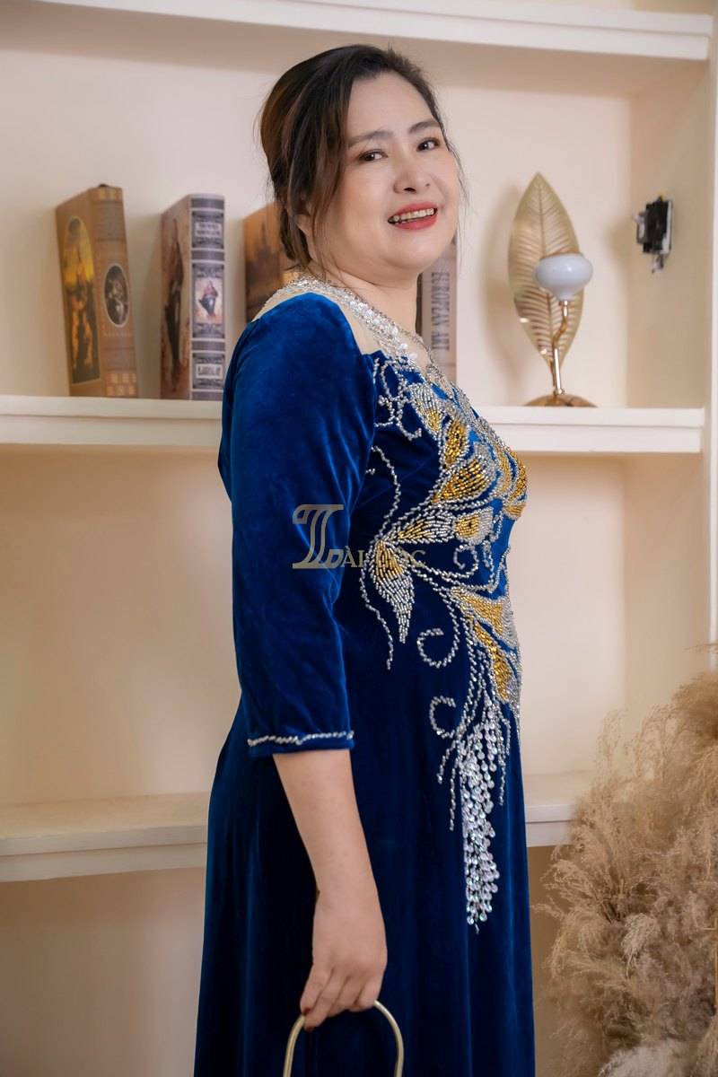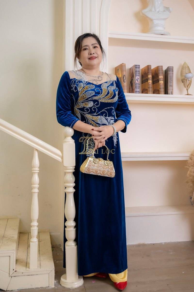 Áo dài làm từ chất liệu nhung cao cấp, đảm bảo độ bền và thoải mái khi mặc. Kiểu dáng cách tân, cổ ren tinh tế tạo nên sự khác biệt và thu hút. Màu xanh biển là lựa chọn phổ biến, giúp bạn trẻ trung và nổi bật. Những hạt cườm đính tỉ mỉ tạo nên điểm nhấn sang trọng cho chiếc áo dài. Áo dài phù hợp cho nhiều dịp, từ lễ cưới, lễ hội đến các sự kiện trang trọng.