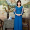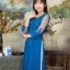 Phần cổ áo được may tròn trịa và phần tay áo được may dài đến cổ tay được đính têm các họa tiết cườm làm tăng độ quý phái cho người mặc. Phần thân áo và tà áo được may rọng rãi tạo cảm giác thoải mái khi di chuyển. Chất liệu ren cao cấp không chỉ mềm mại mà còn mịn màng, mang đến cảm giác thoải mái cho người mặc. Điểm nhấn chính của chiếc áo dài nằm ở màu xanh dương đậm huyền bí cùng họa tiết hoa ở phần thân áo cách điệu được đính cườm tinh tế, tạo nên một vẻ đẹp thanh tao và thuần khiết. Đây chính là lựa chọn hoàn hảo cho các bà sui trong ngày cưới của con cháu, giúp họ thể hiện sự thanh lịch, đẳng cấp và quý phái của mình.