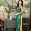 Tay áo dài bó vừa phải, tạo sự thoải mái cho người mặc trong suốt quá trình dự tiệc. tà áo dài chấm gót, bay bổng trong từng bước đi, giúp người mặc trở nên thướt tha, duyên dáng. Điểm nhấn của bộ áo dài nằm ở phần hoa rơi được thêu thủ công tinh tế. Họa tiết hoa rơi được bố trí khéo léo trên tà áo và thân áo, tạo nên một bức tranh thiên nhiên mùa thu đầy lãng mạn. Tông màu xanh lá tượng trưng cho sự tươi mát, hy vọng và may mắn, rất phù hợp với không khí vui tươi của lễ cưới hỏi.