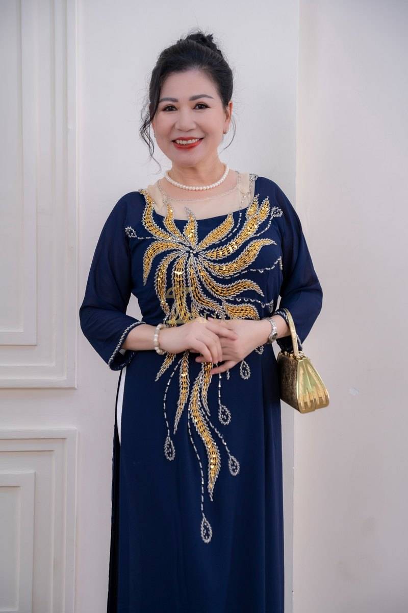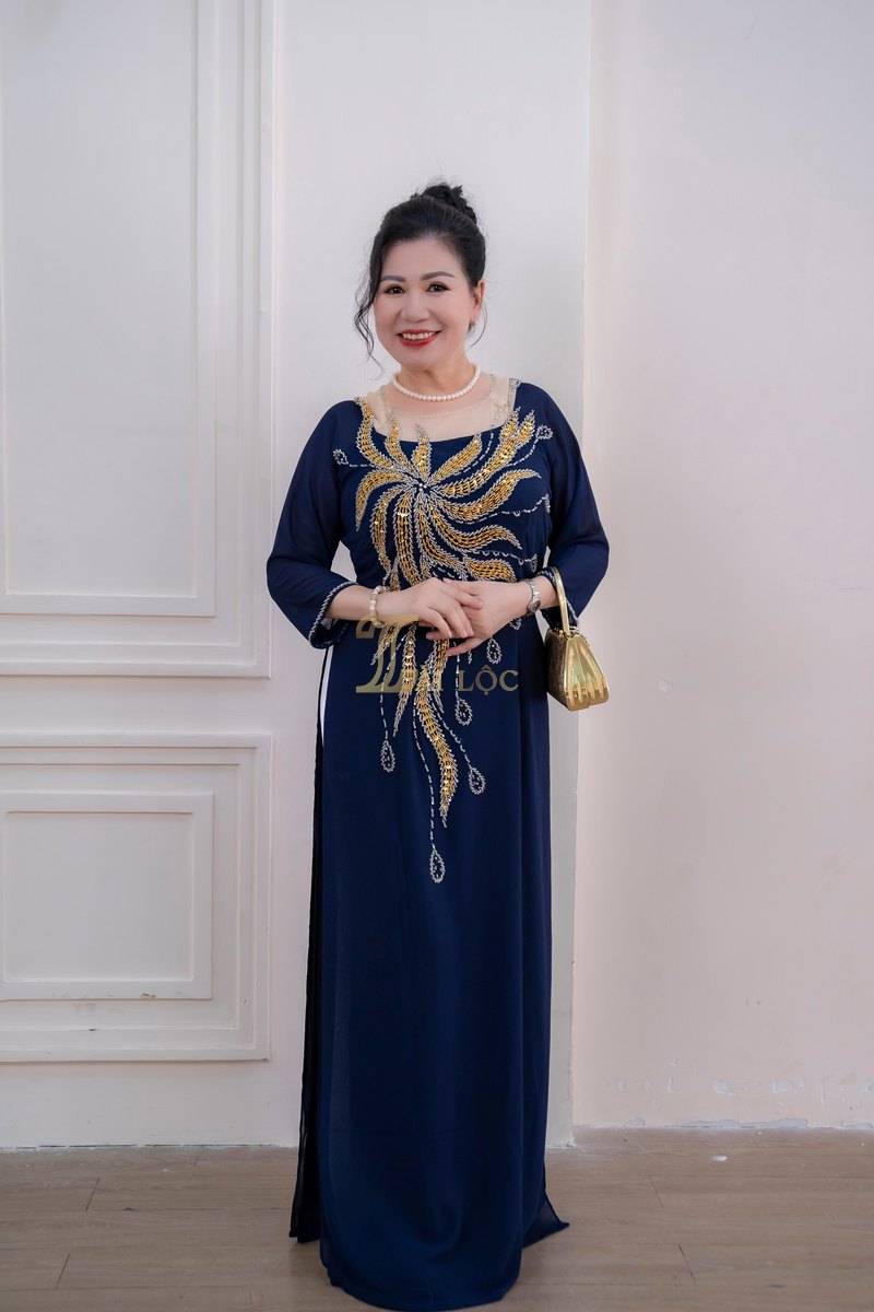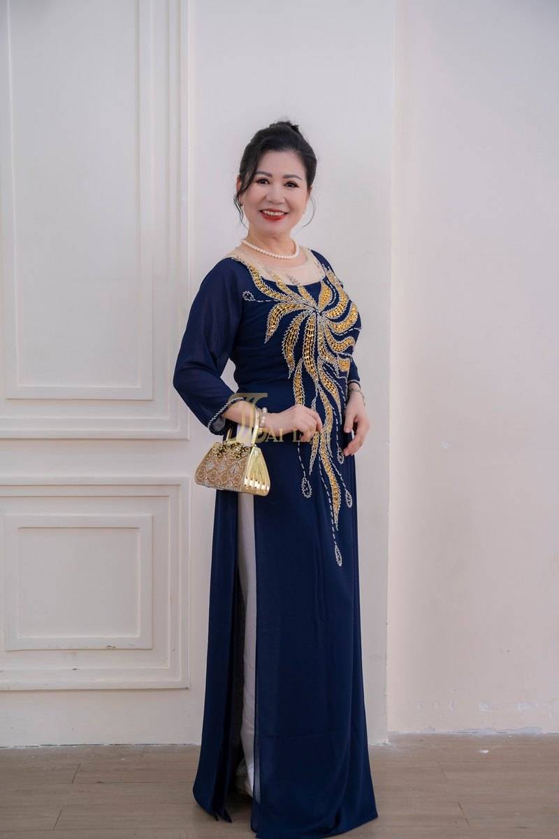 Điểm nhấn của chiếc áo dài là những bông hoa cườm tinh xảo, được thêu tỉ mỉ, tạo nên một bức tranh sống động và đầy màu sắc. Hoa cườm không chỉ làm tăng vẻ đẹp mà còn thể hiện sự cầu kỳ và tinh tế trong từng đường kim mũi chỉ.