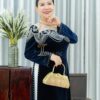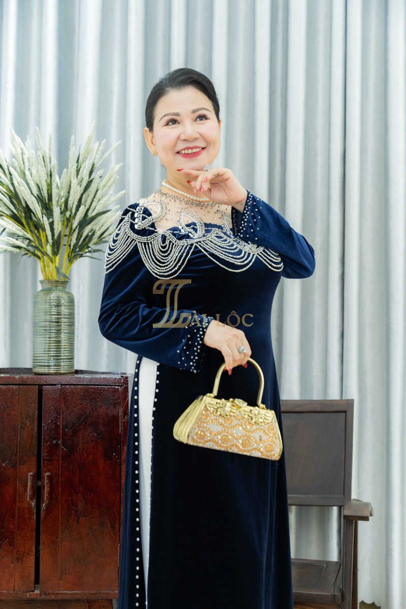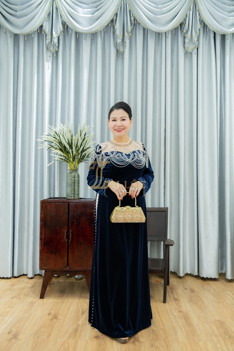 Chiếc áo dài này mang màu xanh đen quyền quý, sắc màu tối giản nhưng không kém phần sang trọng. Màu sắc này làm toát lên vẻ uy quyền và lịch lãm, hoàn hảo để tạo nên hình ảnh một người mẹ đằm thắm và thanh tao. Đặc biệt, phần cổ ren đính cườm là điểm nhấn nổi bật, làm tăng thêm vẻ mềm mại và tinh tế cho tổng thể bộ trang phục.