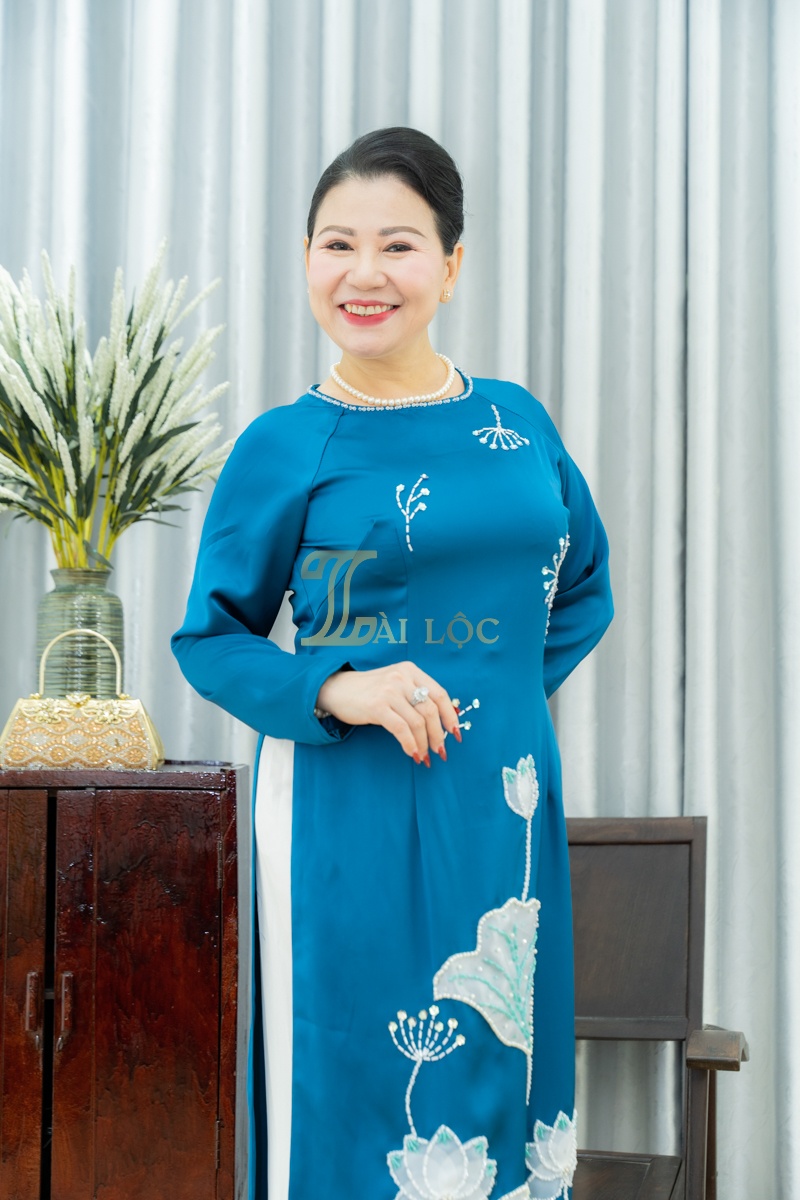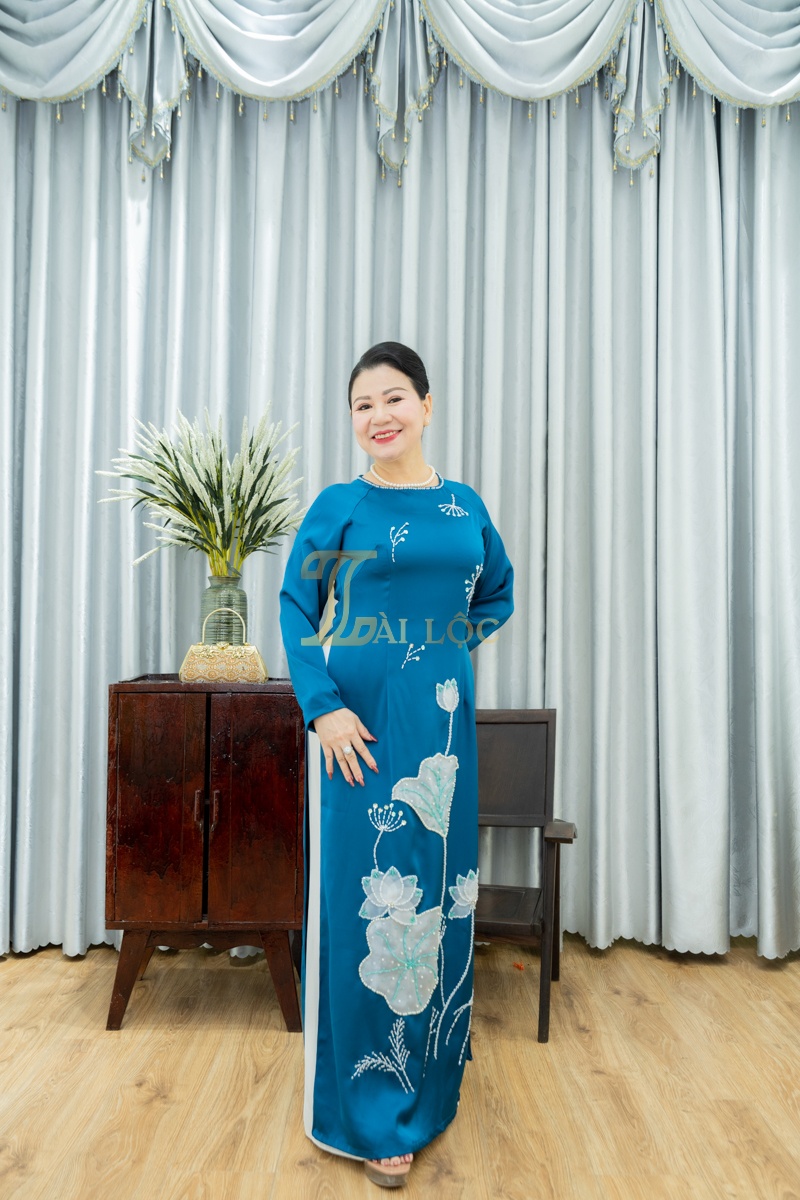 Màu xanh dương trên áo dài tượng trưng cho sự bình yên và thanh khiết. Xanh dương không chỉ làm sáng làn da mà còn mang lại cảm giác nhẹ nhàng, thoải mái. Khi ánh đèn chiếu lên, sắc xanh ấy lấp lánh như biển cả, dịu dàng nhưng mạnh mẽ, giống như tình yêu thương vô bờ bến của người mẹ dành cho con cái.