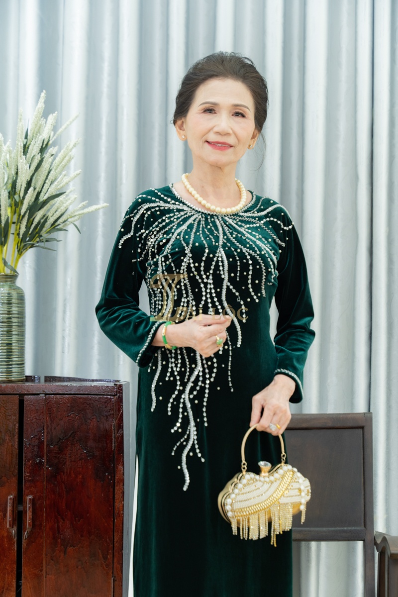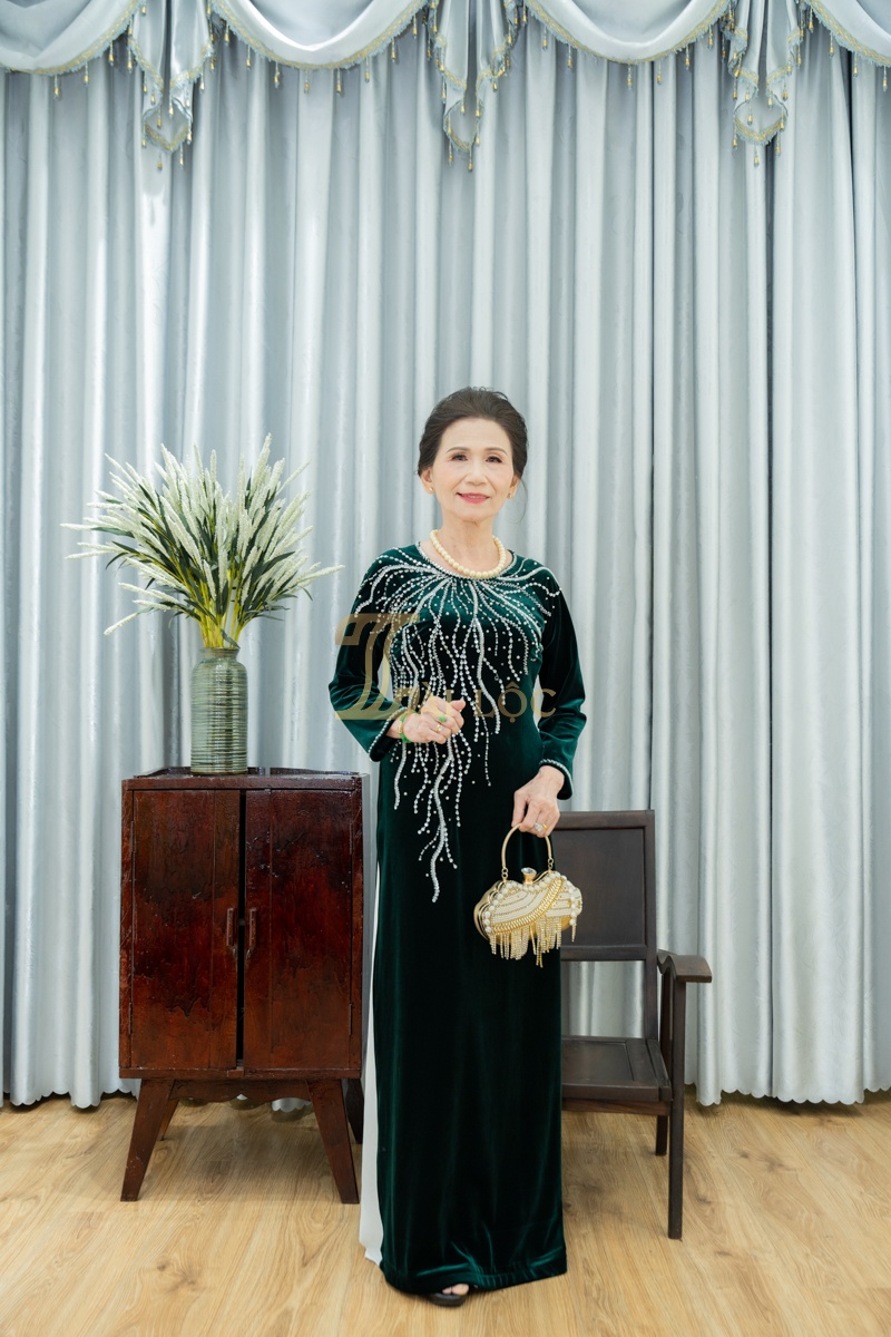 Màu xanh lá của chiếc áo dài bà sui này không chỉ là màu sắc đơn thuần mà còn là biểu tượng của sự hài hòa với thiên nhiên và mang đến cảm giác tươi mới, bình yên. Chất liệu nhung là lựa chọn hoàn hảo cho những dịp trọng đại bởi tính chất mềm mại và vẻ ngoài bóng mịn, sang trọng. Khi diện chiếc áo dài nhung, người mặc sẽ cảm thấy ấm áp và thoải mái, đặc biệt trong những dịp lễ hội, sự kiện quan trọng như lễ cưới.