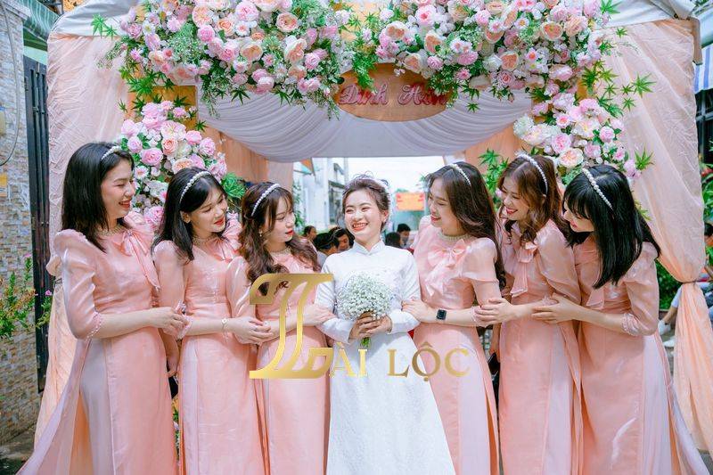Trang phục áo dài bê tráp cho phụ dâu có sự đa dạng về kiểu dáng, mẫu mã và màu sắc, giúp bạn dễ dàng tìm cho mình một bộ trang phục hoàn hảo. Áo dài màu hồng là một trong những lựa chọn phổ biến cho các cô dâu phụ.