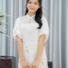 Điểm nhấn của áo dài bưng quả trắng hoa nhài nằm ở thiết kế cổ tròn cách tân rộng. Cổ áo được may ren cao vừa phải, tạo sự kín đáo mà vẫn không kém phần duyên dáng. Tay áo được cách tân với kiểu dáng phồng, ngắn và rộng, buông rủ mềm mại xuống tới khuỷu tay. Kiểu dáng này giúp tôn lên nét mảnh mai, uyển chuyển của người phụ nữ Việt Nam.