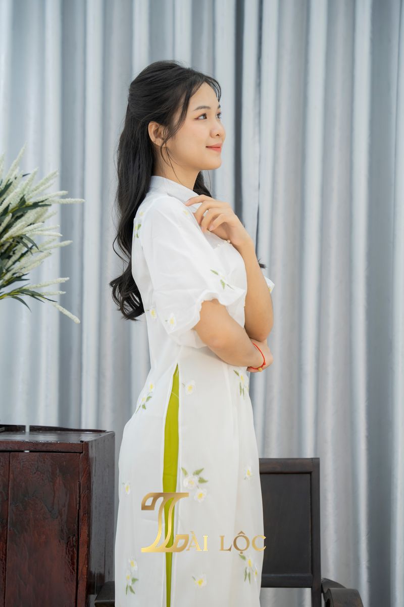 Áo dài bưng quả trắng hoa nhài xanh được kết hợp với một chiếc quần lụa xanh lá tạo cảm giác mát mẻ. Quần được may dài chấm gót, giúp tôn lên sự thướt tha, dịu dàng của người mặc. Để hoàn thiện bộ trang phục, các cô gái thường đeo thêm một đôi hoa tai ngọc trai hoặc bạc, tạo nên một tổng thể thanh lịch, trang trọng.