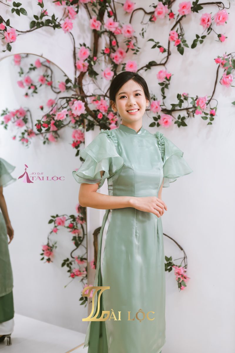 Áo được may từ chất liệu vải phi bóng mịn màng và bề mặt bóng loáng mang lại cảm giác sang trọng cho người mặc trong suốt sự kiện dài. Áo dài màu xanh lá trơn nổi bật tạo điểm nhấn ấn tượng và phù hợp với không gian tươi vui, phồn hoa của các dịp lễ, tiệc. Áo dài được thiết kế theo dáng áo cổ cao mang đến vẻ đẹp vừa hiện đại vừa giữ được nét truyền thống đặc trưng. Đường tà áo dài chấm gót, uyển chuyển theo từng bước chân, giúp người mặc trở nên yêu kiều và duyên dáng hơn.