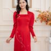 Áo dài cô dâu sở hữu thiết kế tinh tế với phần cổ vuông thanh lịch, tôn lên nét đẹp dịu dàng và quyến rũ của người phụ nữ. Hoa được thêu tinh xảo, tỉ mỉ trên nền vải đỏ đô rực rỡ, mang đến một vẻ đẹp vừa sang trọng vừa mang đậm nét truyền thống. Tà áo dài cũng được thêu hoa tỉ mỉ làm nổi bật lên bộ áo dài.