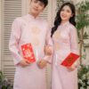 Áo Dài Cặp Đám Cưới Cô Dâu Chú Rể Lụa Hồng Một Chữ Hỷ Trắng – CDCRT30