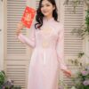 Áo dài dành cho cô dâu được may trên chất liệu lụa tơ tằm cao cấp, mềm mại và thoáng mát, tạo cảm giác thoải mái khi mặc. Phần cổ áo theo kiểu truyền thống, tay áo được may vừa vặn. Tà áo được thiết kế ôm vừa phải để tạo nên nét duyên dáng của người phụ nữ Việt. Màu hồng nhạt nhẹ nhàng, tạo nét dịu dàng, nữ tính cho người mặc. Áo được trang trí bằng họa tiết hoa chữ Hỷ trước ngực, biểu tượng cho sự viên mãn, hạnh phúc trong hôn nhân.