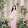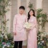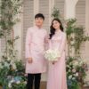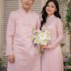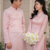 Áo dài với chất liệu lụa hồng mềm mại, nhẹ nhàng tạo nên sự sang trọng, đằm thắm cho cô dâu chú rể khi mặc. Áo dài cô dâu được thiết kế cổ cao truyền thống, ôm sát cơ thể tôn lên đường cong quyến rũ của người phụ nữ. Tay áo dài thướt tha,không quá ôm sát điểm xuyết những họa tiết thêu một chữ hỷ tinh tế, tạo nên vẻ đẹp thanh lịch và duyên dáng. Quần dài ống rộng giúp cô dâu di chuyển nhẹ nhàng và thoải mái trong ngày vui.