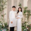 Áo dài cưới cặp với chất liệu lụa trắng dày dặn, bền đẹp, không bai xù, nhăn nhúm. Màu trắng tinh khôi, tượng trưng cho sự thuần khiết, trong sáng và hạnh phúc viên mãn.