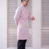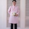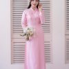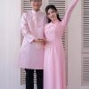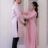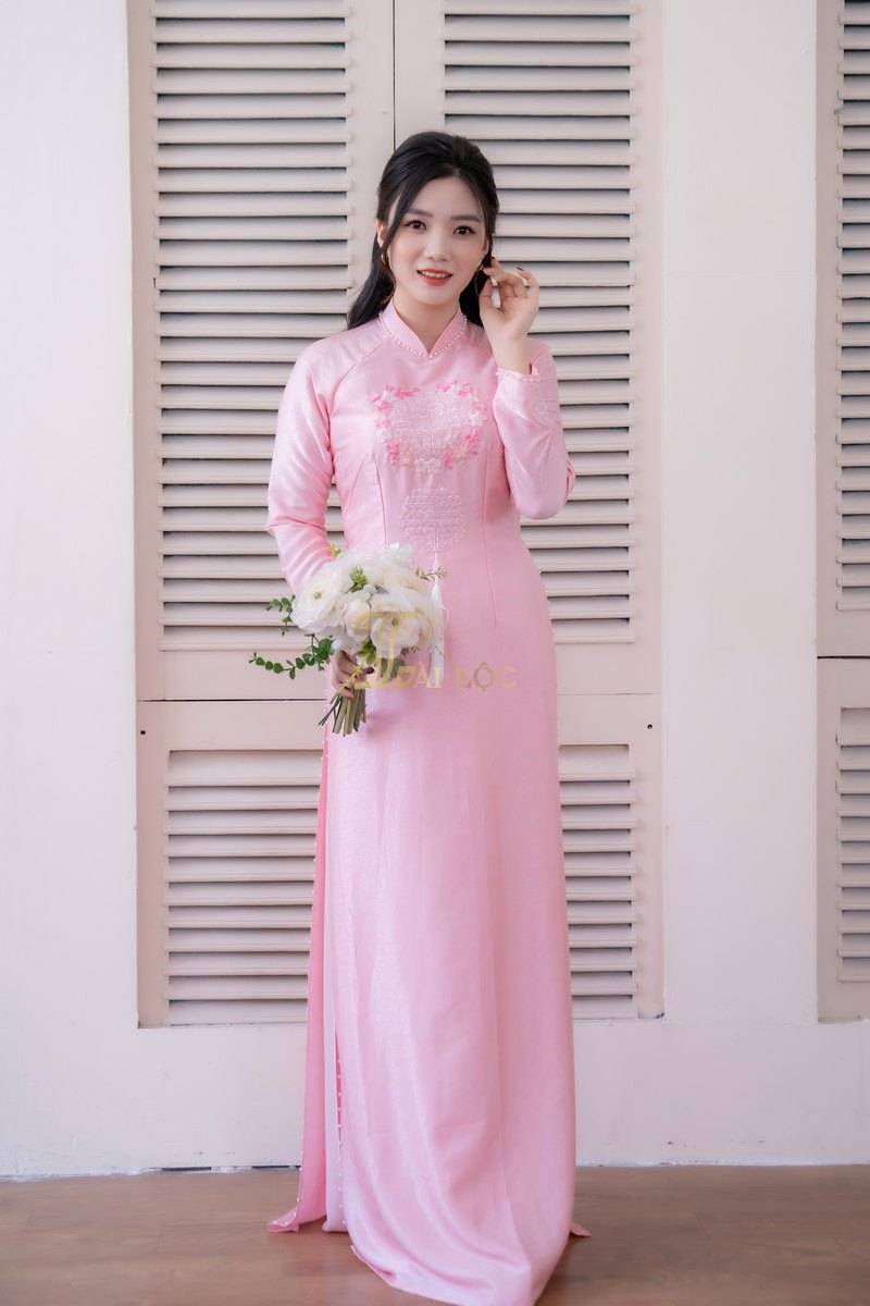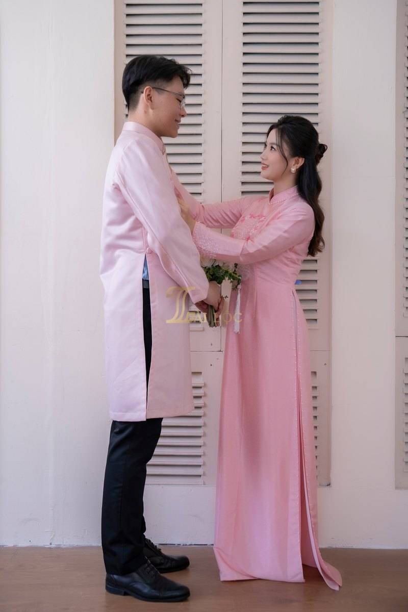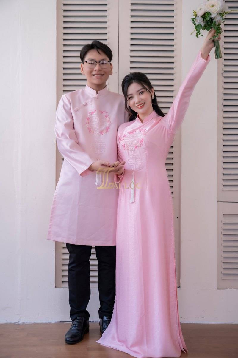 Áo dài được thiết kế theo kiểu truyền thống tay dài, mang đến sự thanh lịch và trang nhã. Thiết kế này không chỉ tôn vinh vẻ đẹp văn hóa mà còn giúp cô dâu và chú rể cảm thấy thoải mái trong suốt buổi lễ. Mẫu áo dài này được làm từ lụa cao cấp, mang lại cảm giác mềm mại và sang trọng. Màu hồng chủ đạo của áo dài tạo nên vẻ đẹp nhẹ nhàng và lãng mạn. Màu hồng không chỉ phù hợp với không khí của ngày cưới mà còn dễ dàng phối hợp với nhiều phụ kiện khác. Áo dài được kết cườm quanh cổ và tay áo, cùng với họa tiết chữ Hỷ thêu vòng hoa ở trước ngực. Chữ Hỷ là biểu tượng của sự hạnh phúc và may mắn, trong khi vòng hoa thêu tinh tế làm nổi bật thêm vẻ đẹp của trang phục.