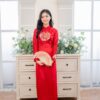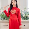 Áo dài màu đỏ chủ đạo biểu trưng cho may mắn, tài lộc và niềm vui. Cổ áo được may theo kiểu truyền thống hiện đại. Xung quanh cổ tay được thêu vòng hoa càng làm nổi bật cô dâu trong ngày cưới. Tà áo dài đến gót chân tạo sự uyển chuyển khi đi lại. Bộ áo dài có nhiều kích thước khác nhau để phù hợp với mọi dáng vóc.