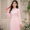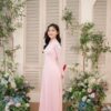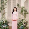 Áo dài được may bằng chất liệu lụa hồng cao cấp, mềm mại và thoáng mát. Màu sắc này cũng giúp tôn da, giúp người mặc trông trẻ trung và rạng rỡ hơn.