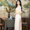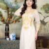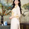 Áo dài form ôm nhẹ, cổ cao thêu hoa tinh tế, tay dài kín đáo cùng tà áo dài thanh thoát. kết hợp chung với quần dài ống rộng tạo sự thoải mái khi di chuyển. Màu kem của áo dài nhẹ nhàng, trẻ trung, tôn lên vẻ đẹp ngọt ngào, nữ tính của cô dâu. Họa tiết hoa văn vàng tinh tế được thêu tay tỉ mỉ, tạo điểm nhấn nổi bật và thu hút.