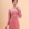 Áo dài nổi bật với sắc hồng dịu dàng, biểu trưng cho tình yêu, sự lãng mạn và hạnh phúc, giúp bà sui thêm trẻ trung, rạng rỡ. Chất liệu nhung cao cấp mang lại vẻ quý phái, mềm mại, thoải mái và tạo hiệu ứng bắt sáng độc đáo.