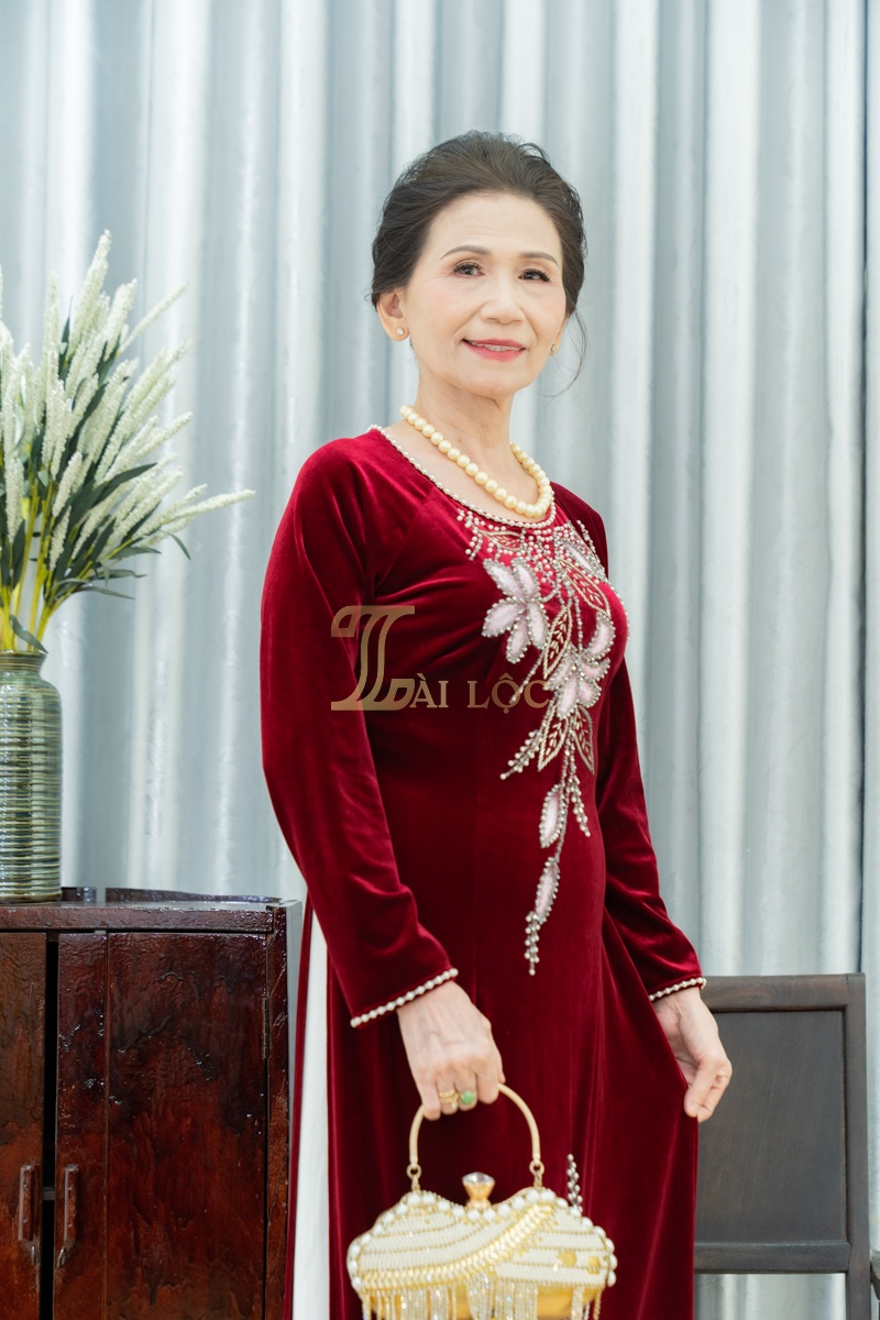 Màu đỏ đô của chiếc áo dài BSĐN146 tỏa ra sức hút mạnh mẽ. Đây là sắc đỏ đậm đà, trầm ấm, gợi lên cảm giác sang trọng và quý phái. Màu đỏ đô không chỉ thu hút mà còn mang đến ý nghĩa của sự may mắn, viên mãn, phù hợp với vai trò quan trọng của bà sui trong ngày cưới. Được làm từ chất liệu nhung cao cấp, chiếc áo không chỉ mượt mà, mà còn tạo nên hiệu ứng ánh sáng nhẹ nhàng, lấp lánh, giúp tôn lên nét đẹp quý phái cho người mặc. Trên nền nhung đỏ ấy, những họa tiết hoa lá kết cườm được thêu đính một cách tỉ mỉ, tạo điểm nhấn nổi bật.