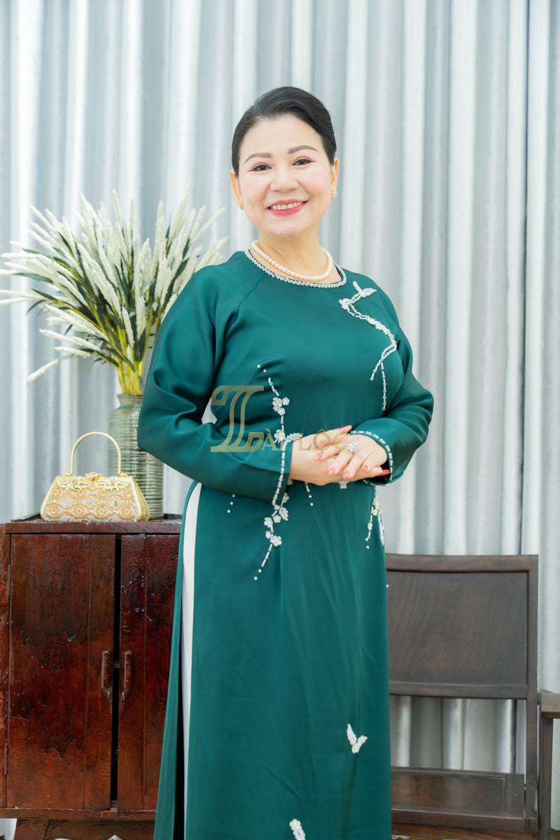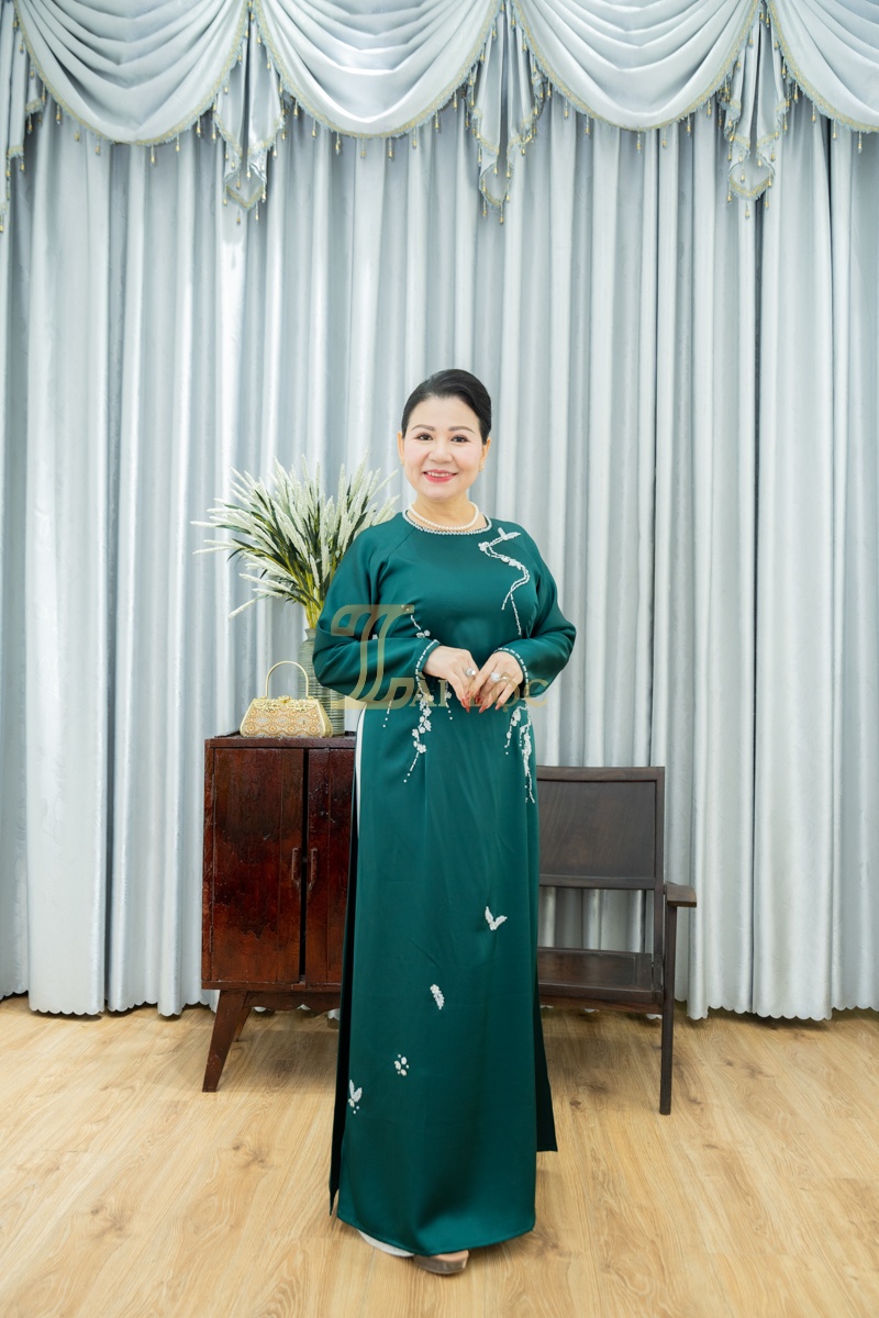 Chiếc áo dài được thiết kế với cổ thuyền duyên dáng, giúp tôn lên phần cổ cao, tạo nên nét thanh thoát và quý phái. Phần cổ áo và tay áo đính cườm được thực hiện thủ công, từng viên cườm lấp lánh đính kết tỉ mỉ tạo nên sự nổi bật đầy tinh tế. Những viên cườm này như những ngôi sao nhỏ, lấp lánh tỏa sáng trên nền xanh lá, thu hút ánh nhìn của mọi người xung quanh.
