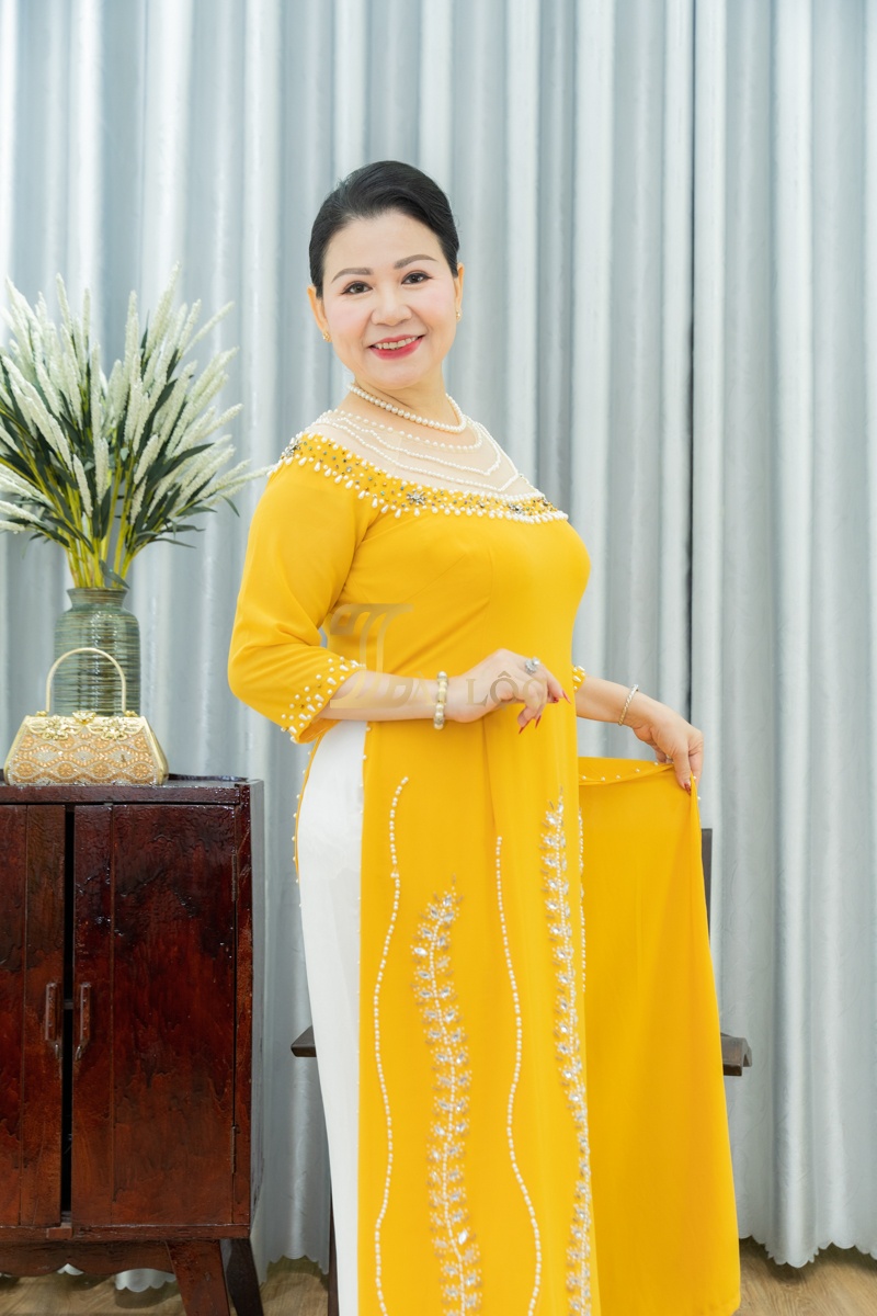 Chiếc áo dài lụa vàng mang đến cảm giác ấm áp và rực rỡ. Màu vàng không chỉ là biểu tượng của sự may mắn mà còn là màu của sự cao quý, sang trọng. Chất liệu lụa tạo nên điểm nhấn đặc biệt cho áo dài sui gia này. Lụa không chỉ mềm mại mà còn có độ bóng tự nhiên, mang lại sự thoải mái và dễ chịu khi mặc.