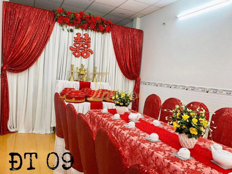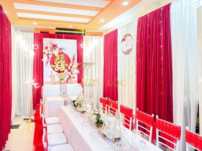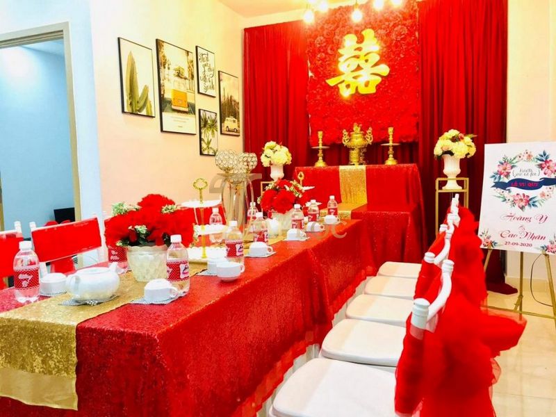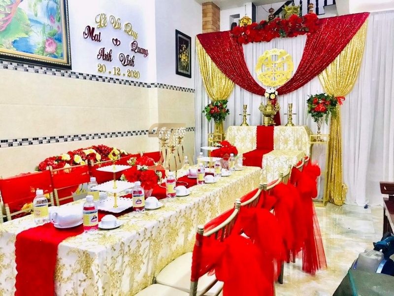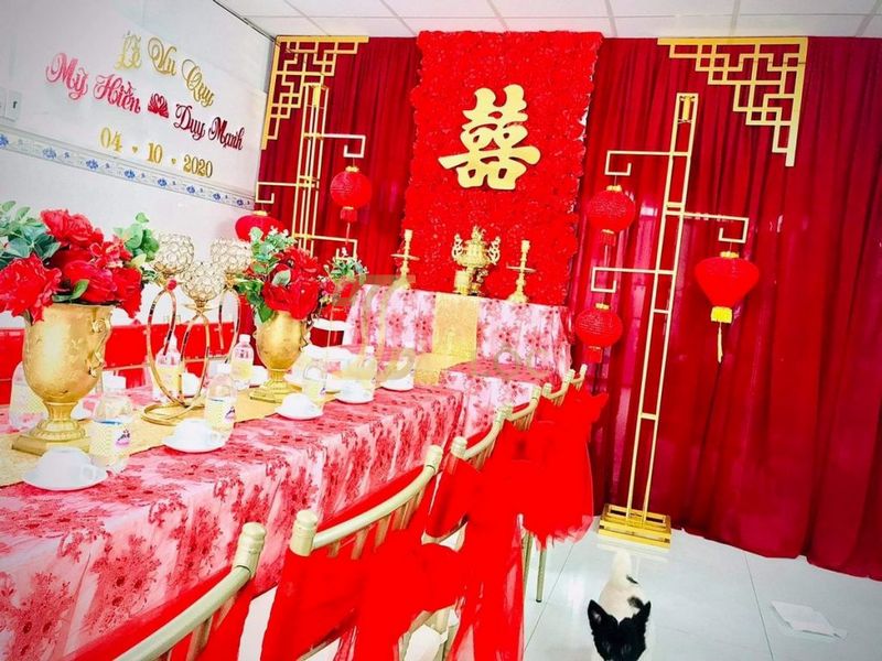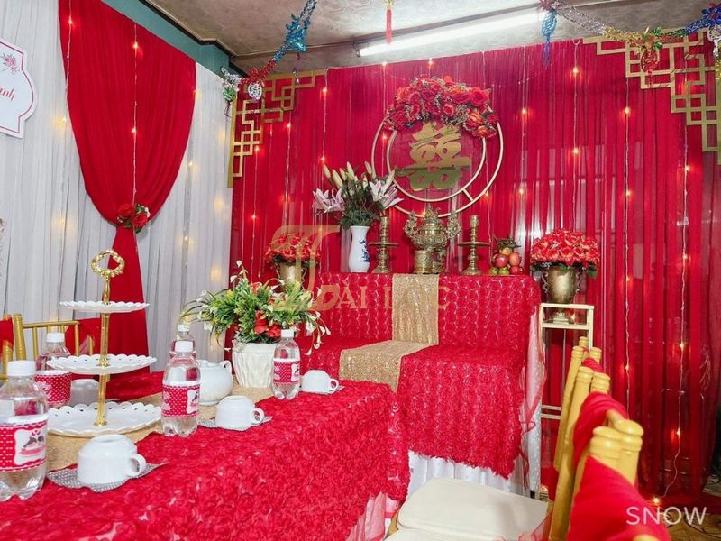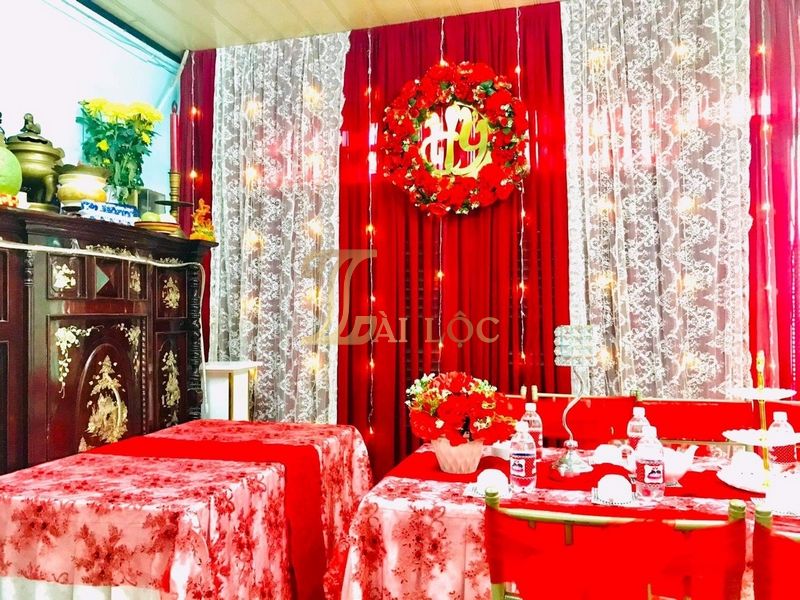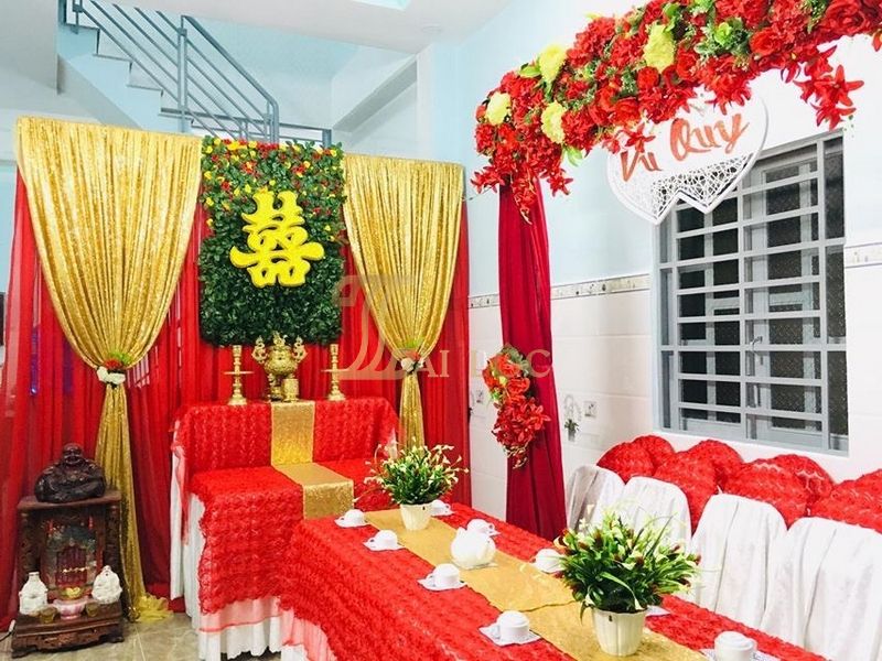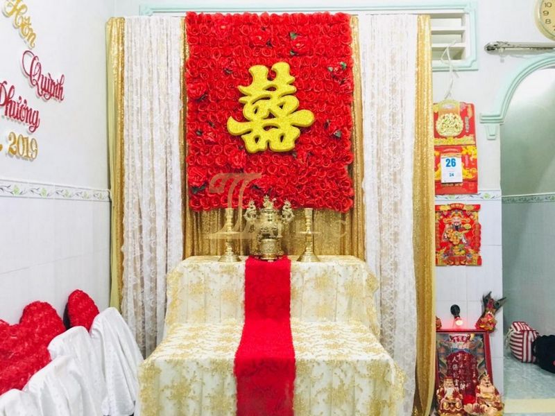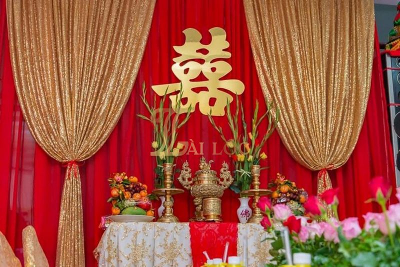 Chữ Hỷ hoặc câu đối đỏ: Chữ Hỷ và câu đối đỏ là những yếu tố không thể thiếu trong lễ cưới truyền thống, giúp tăng thêm sự ấn tượng và ý nghĩa cho ngày trọng đại. Khi đặt chữ Hỷ và câu đối đỏ, cần đặt chúng ở vị trí trung tâm và đảm bảo rằng câu đối được cố định ở vị trí đối xứng để tạo ra sự hài hòa toàn diện. Để làm cho bàn thờ gia tiên trở nên nổi bật và ấn tượng hơn, bạn có thể sử dụng đèn LED phối hợp màu sắc hài hòa với màu của bàn thờ để trang trí.