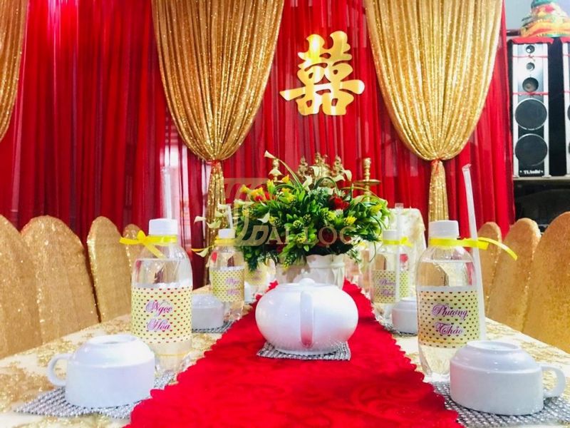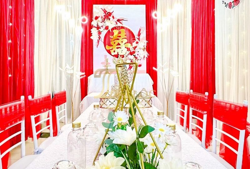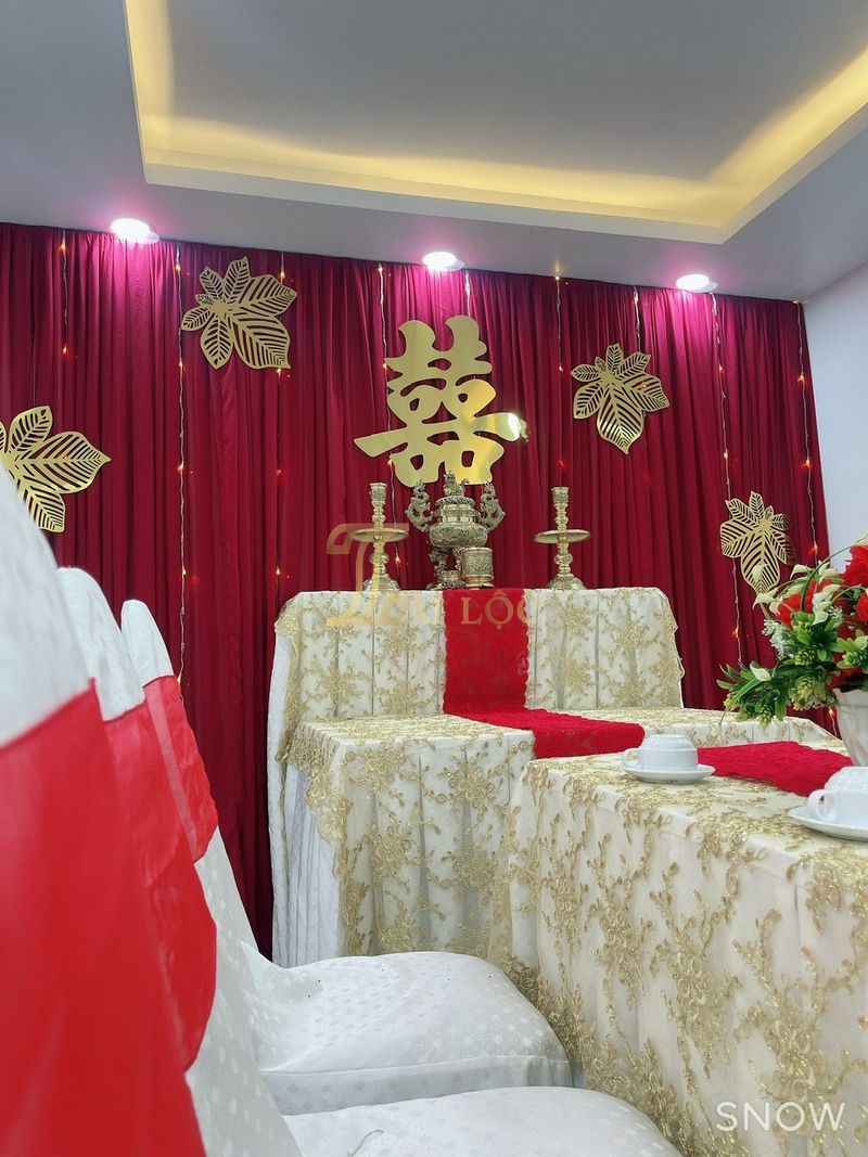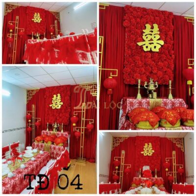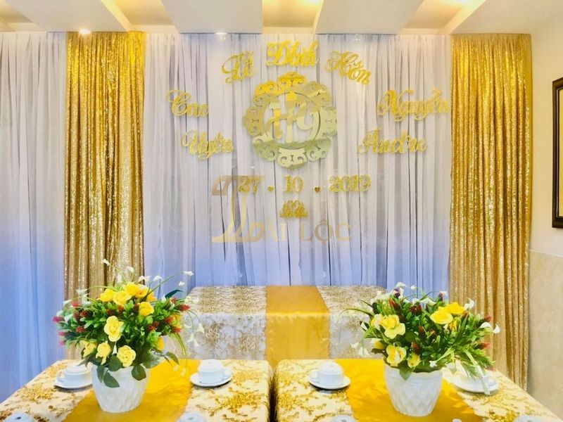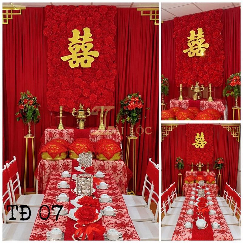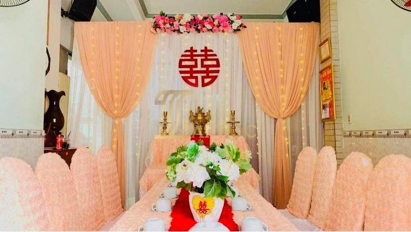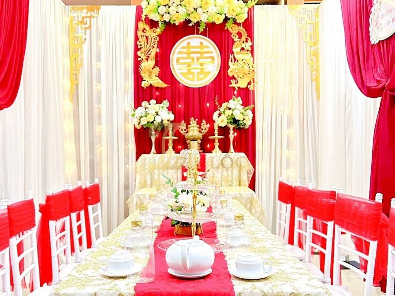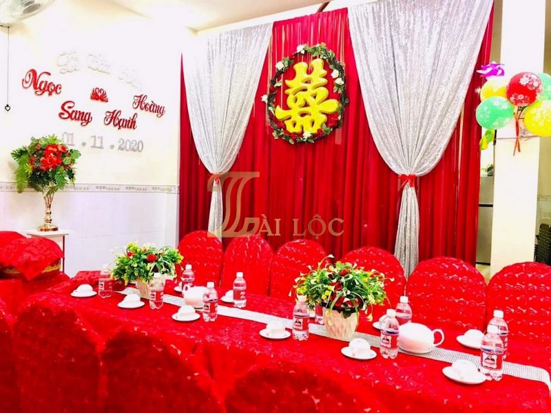 Chữ Hỷ hoặc câu đối đỏ: Chữ Hỷ và câu đối đỏ là những yếu tố không thể thiếu trong lễ cưới truyền thống, giúp tăng thêm sự ấn tượng và ý nghĩa cho ngày trọng đại. Khi đặt chữ Hỷ và câu đối đỏ, cần đặt chúng ở vị trí trung tâm và đảm bảo rằng câu đối được cố định ở vị trí đối xứng để tạo ra sự hài hòa toàn diện. Để làm cho bàn thờ gia tiên trở nên nổi bật và ấn tượng hơn, bạn có thể sử dụng đèn LED phối hợp màu sắc hài hòa với màu của bàn thờ để trang trí.