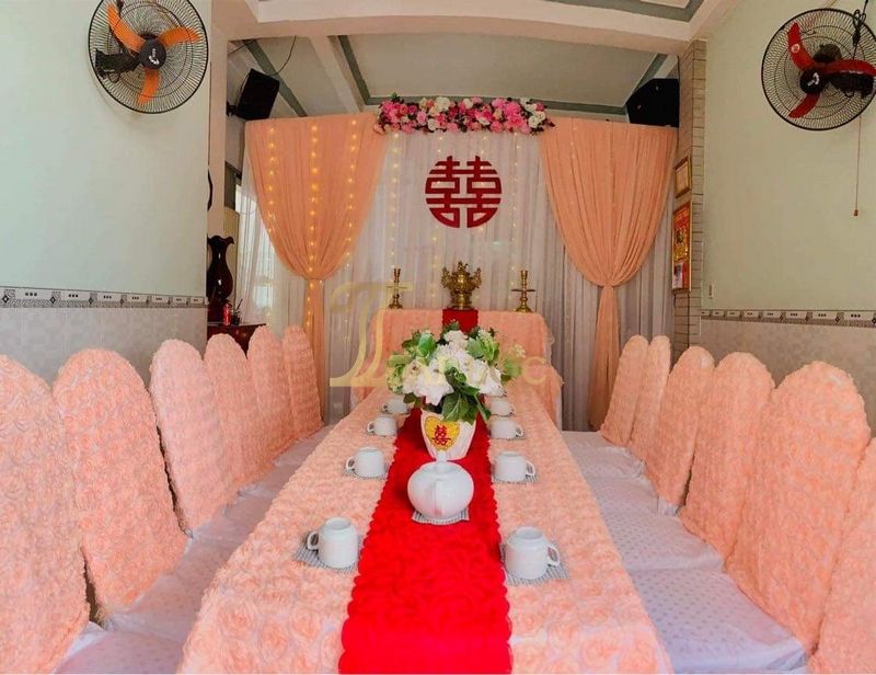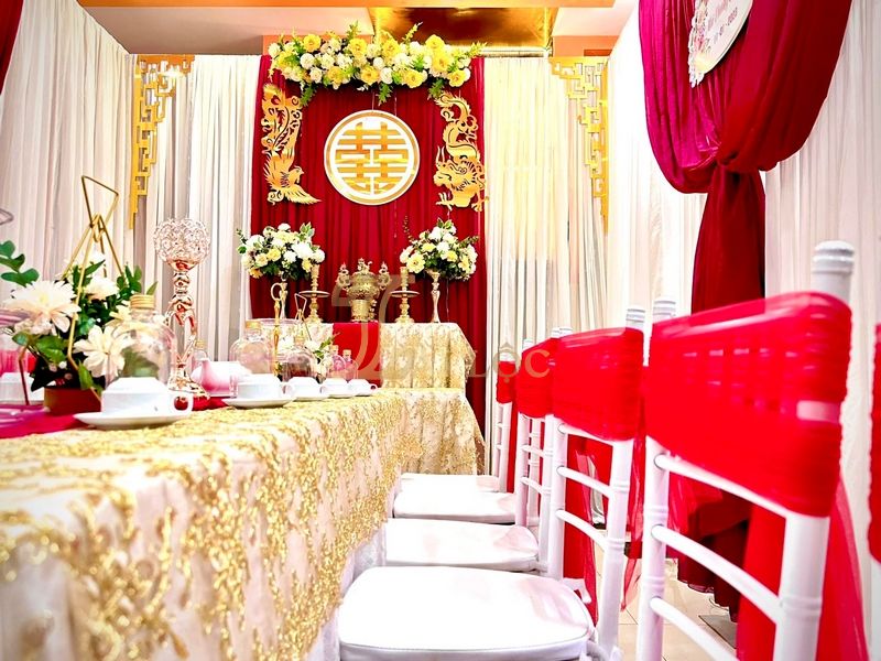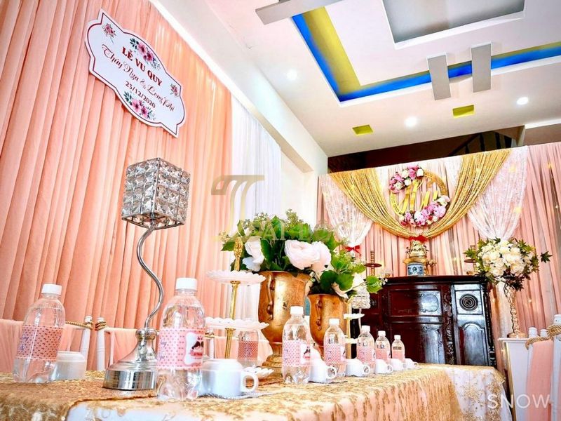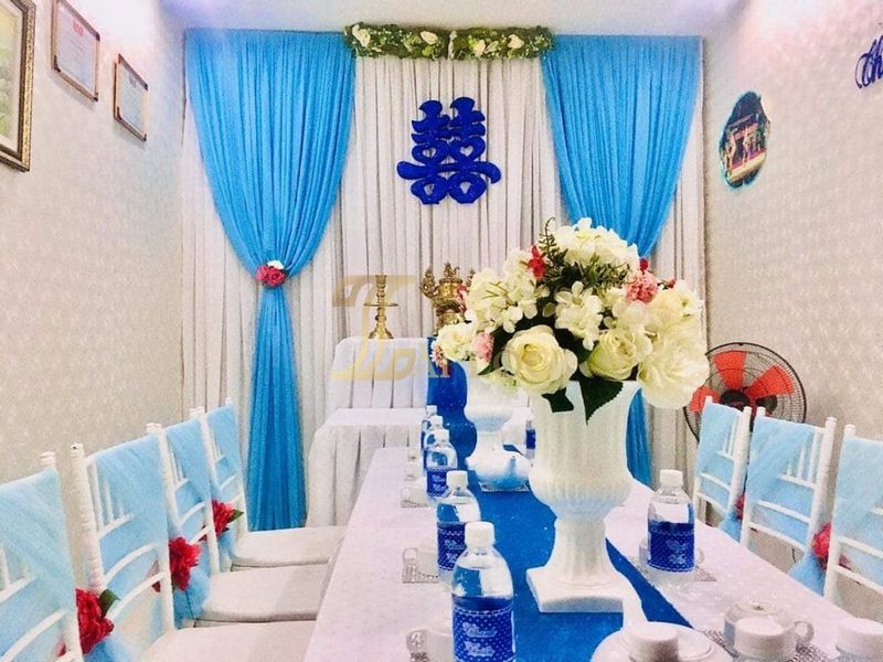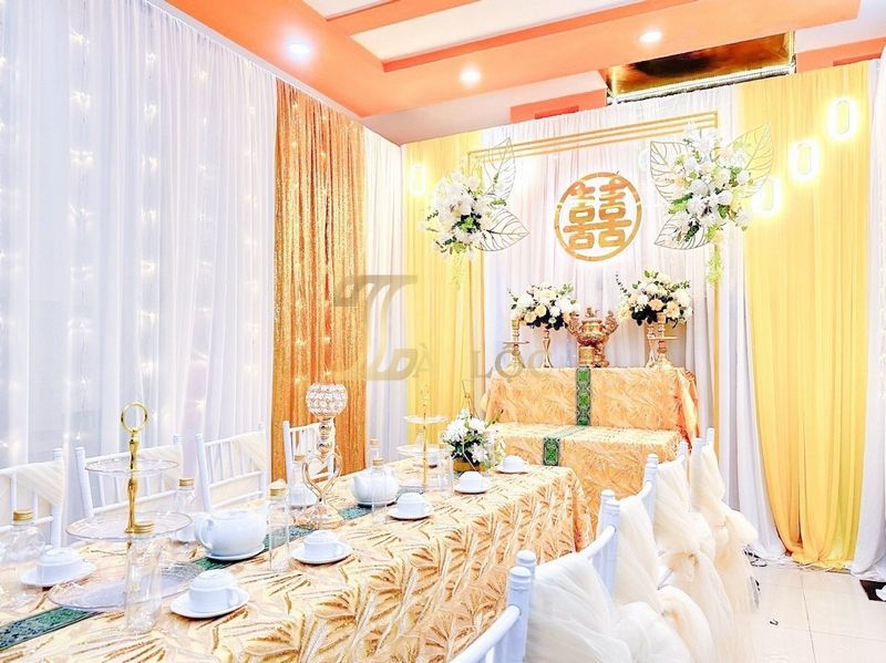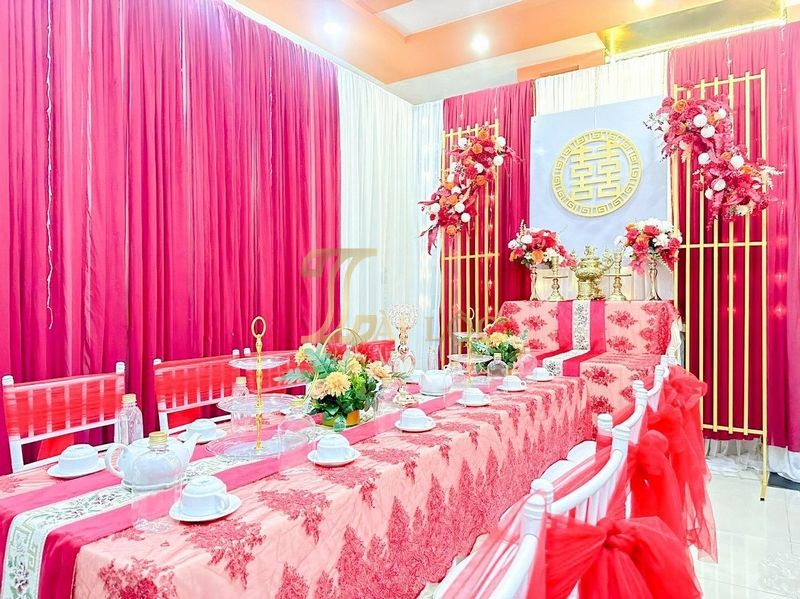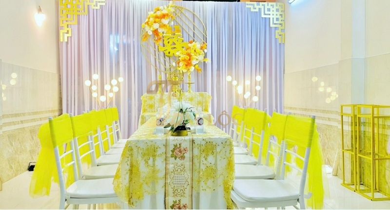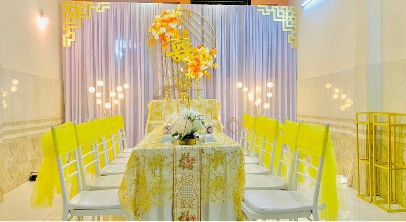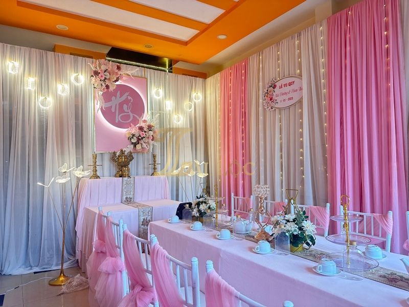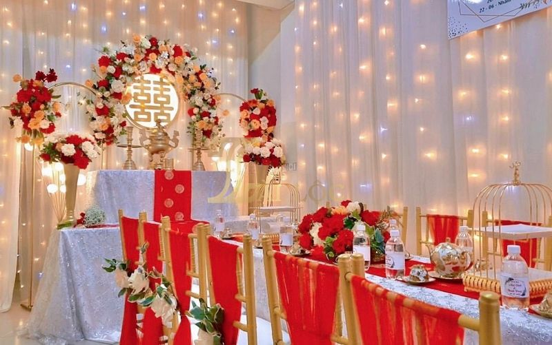 • Không gian đón khách: Các yếu tố trang trí nên được thiết kế sao cho phù hợp với không gian bao gồm bàn ghế, khu vực ngồi và rạp cưới, nhằm tạo ra một tổng thể hài hòa về màu sắc và thiết kế.