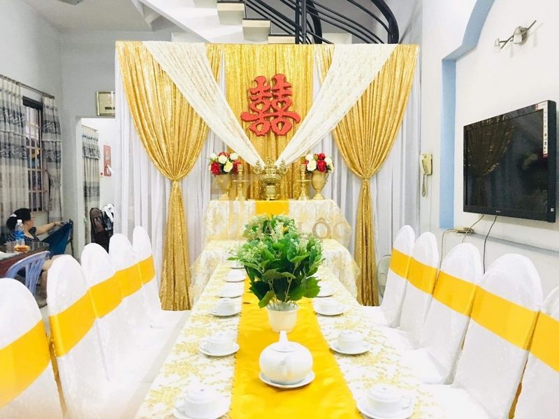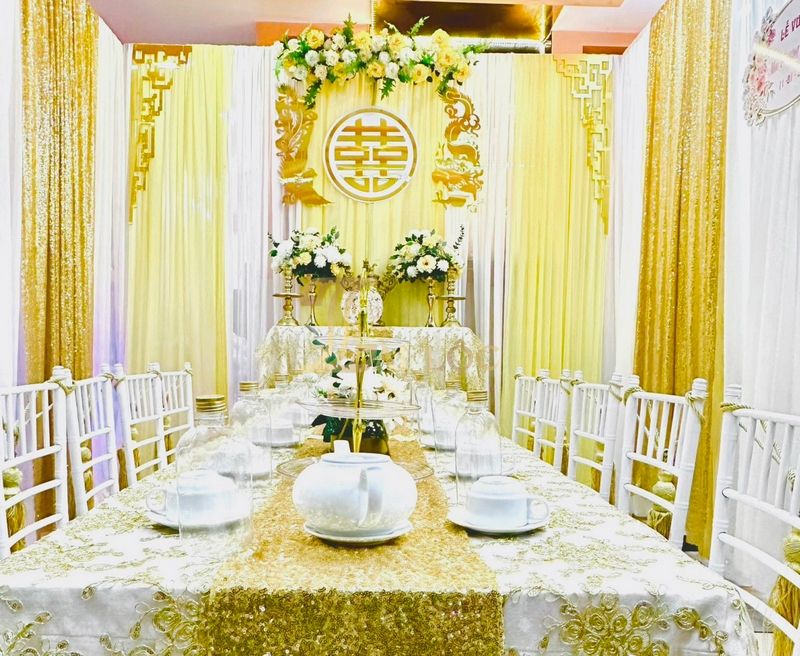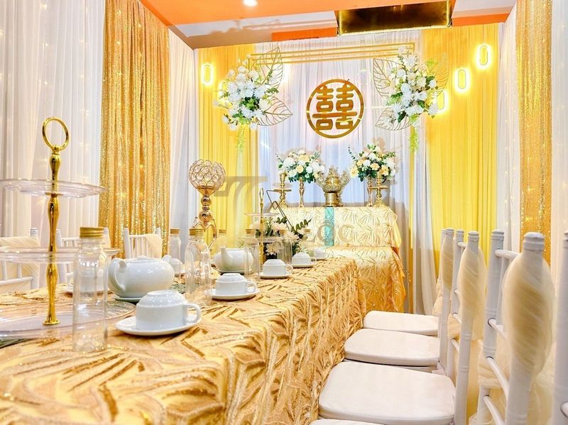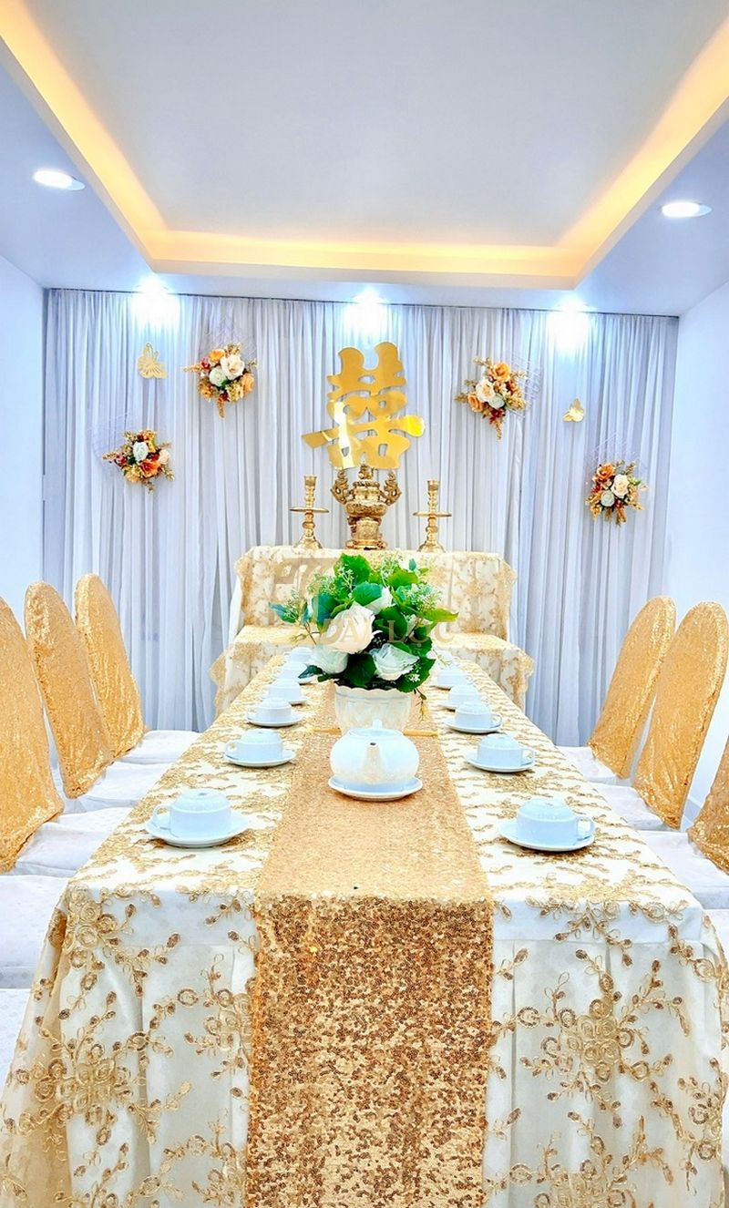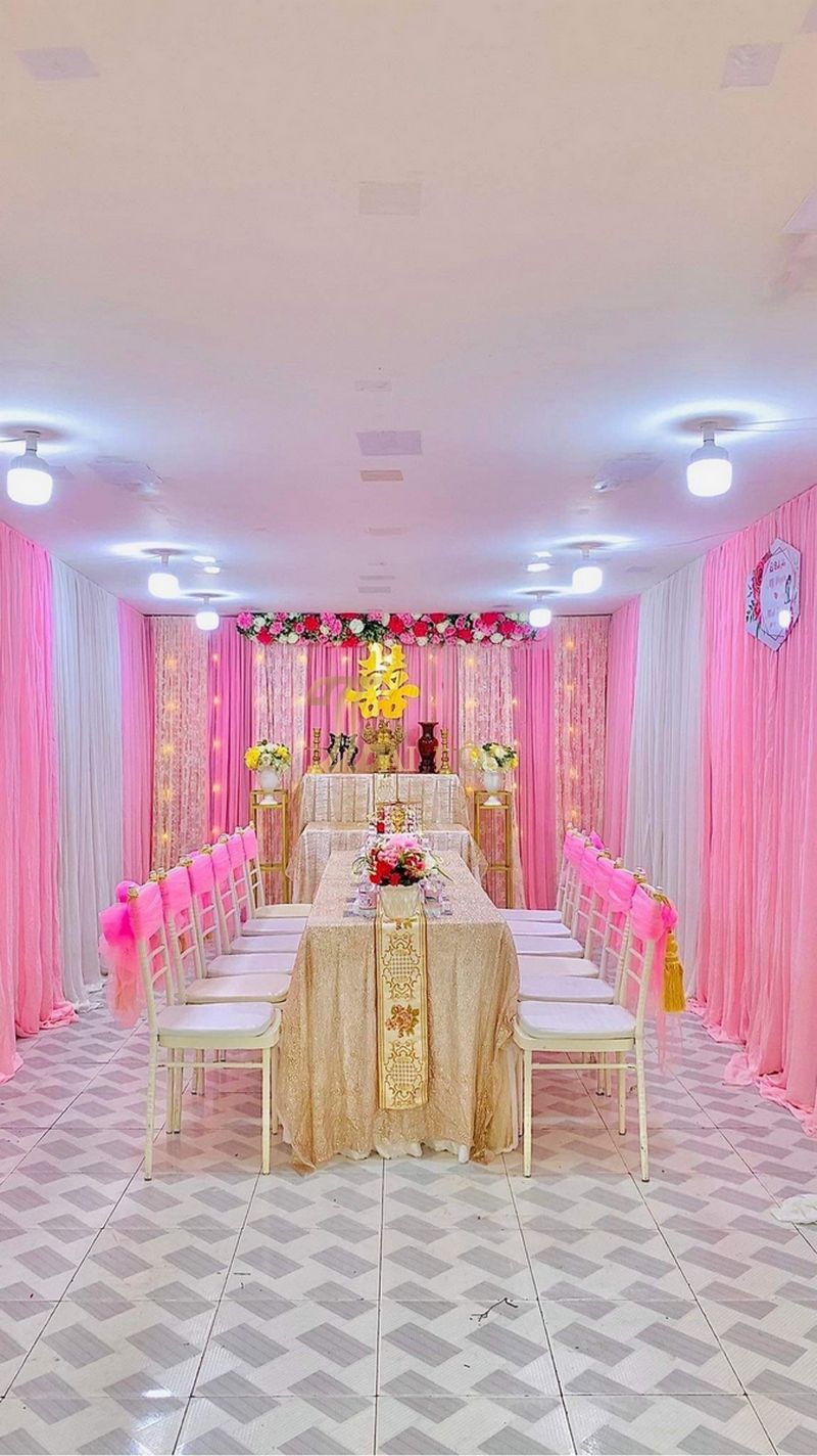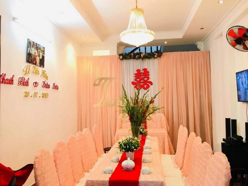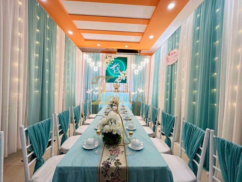 • Không gian đón khách: Các yếu tố trang trí nên được thiết kế sao cho phù hợp với không gian bao gồm bàn ghế, khu vực ngồi và rạp cưới, nhằm tạo ra một tổng thể hài hòa về màu sắc và thiết kế.