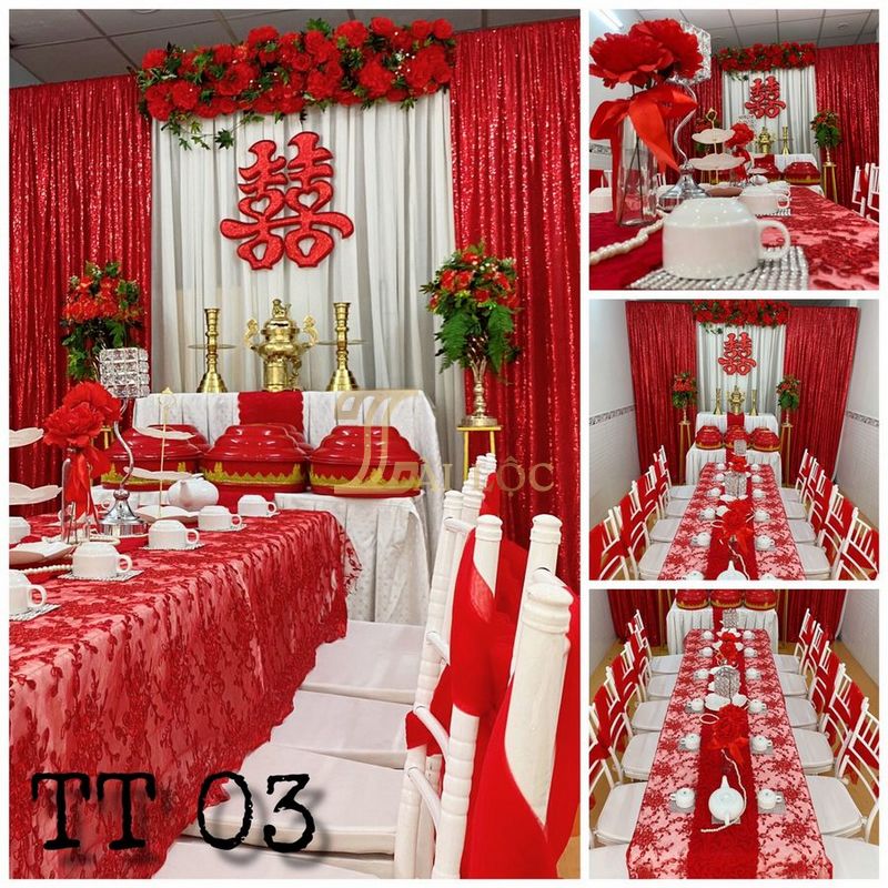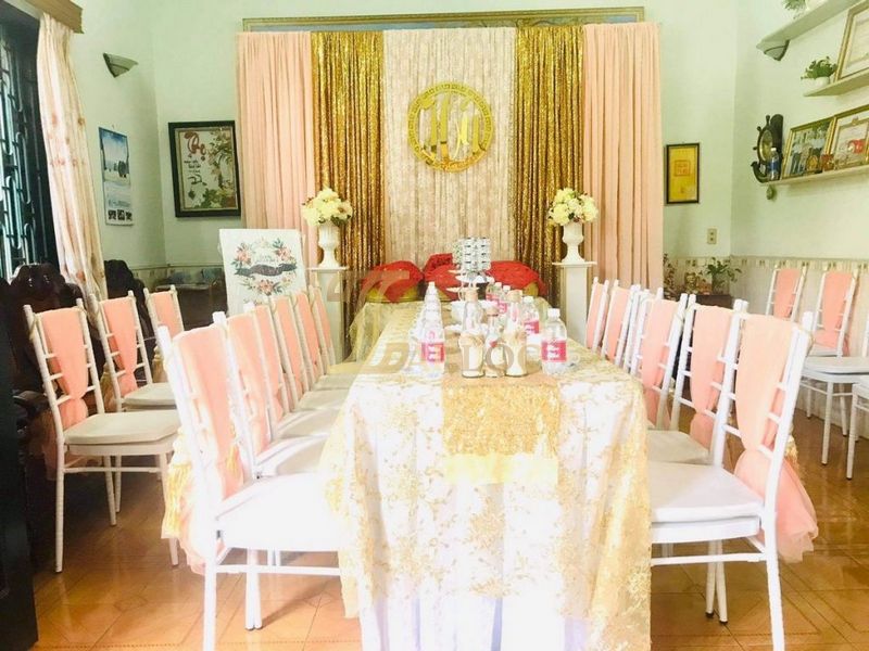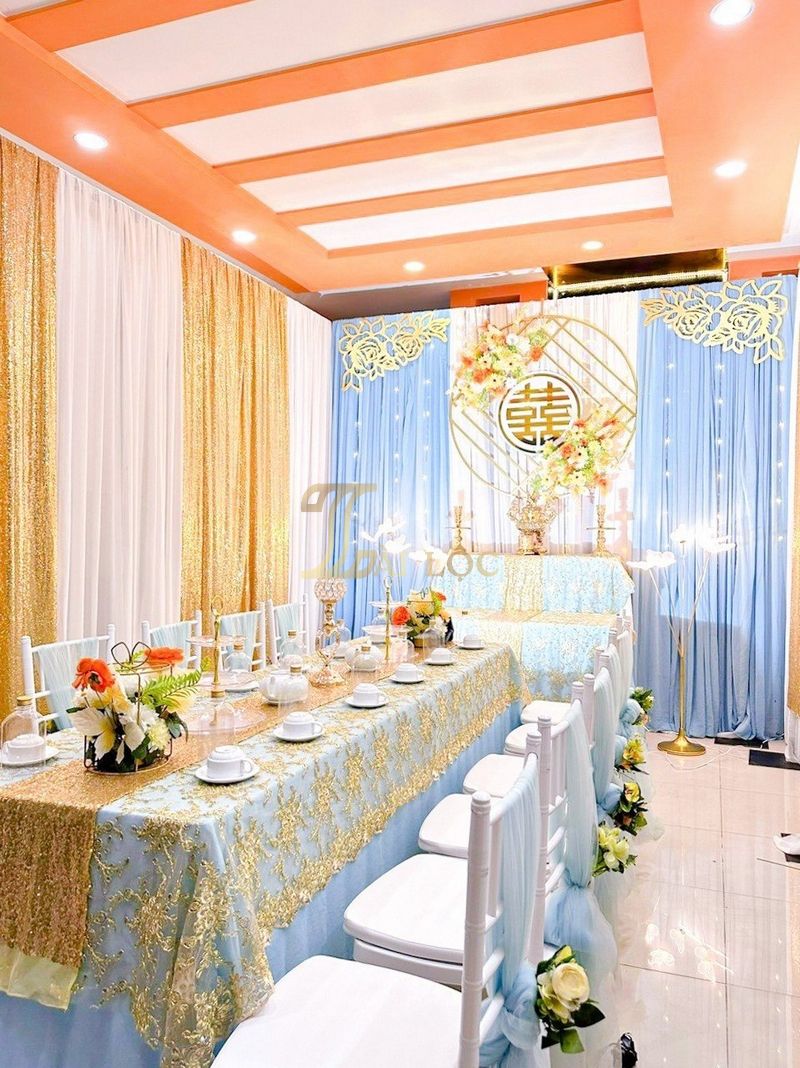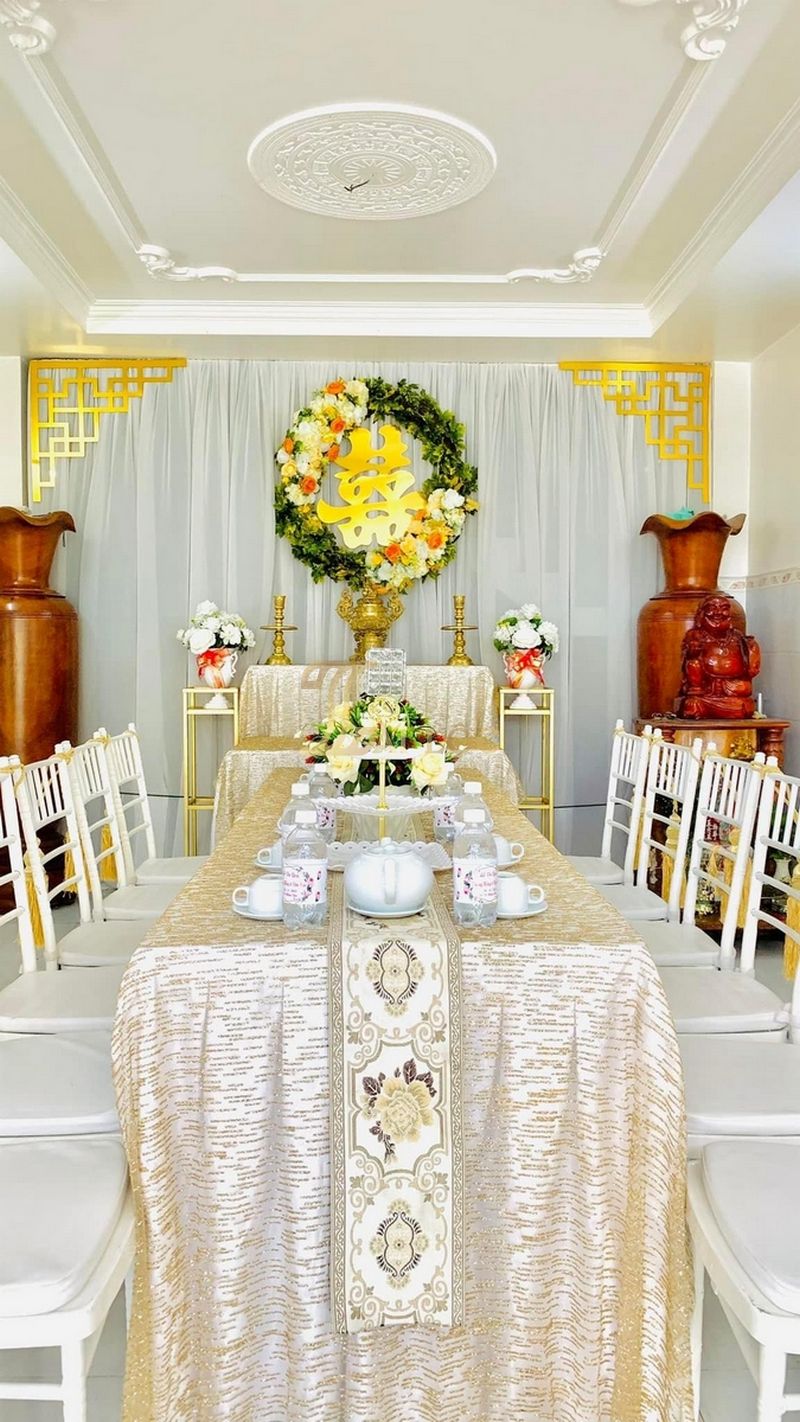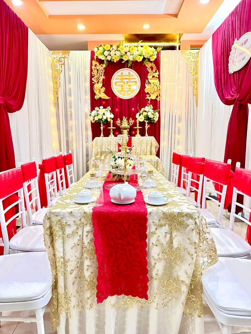 – 2 bàn hai họ 12 ghế  ( 2 bàn dài 2.4m) (bao bàn ghế bằng vải gấm sang trọng k sử dụng vải thun)