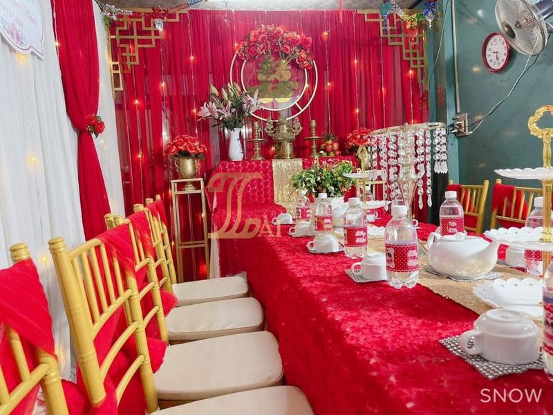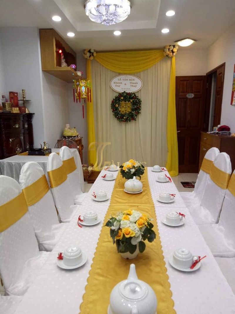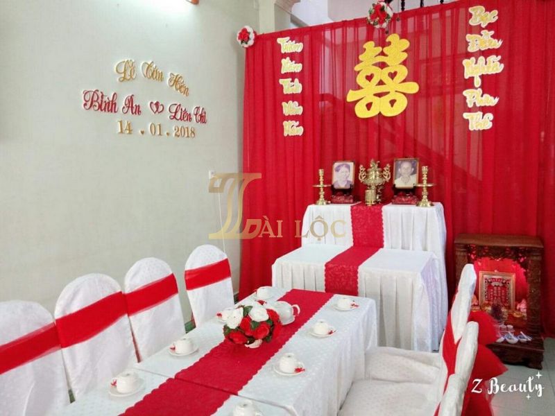 Bàn thờ tổ tiên trong buổi lễ đám hỏi không cần quá phức tạp, nhưng vẫn cần có bộ lễ hương và mâm 6 quả. Bên cạnh việc trang trí bàn thờ tổ tiên, chúng tôi cũng sẽ trang trí bàn tiếp khách, sắp xếp lọ hoa, cung cấp ghế nệm cho hai họ theo yêu cầu của quý khách. Các cửa hàng dịch vụ trang trí đám cưới tại TP HCM sẵn sàng trang trí bàn thờ tổ tiên trong buổi lễ đám hỏi với giá chỉ từ 2 triệu đồng.