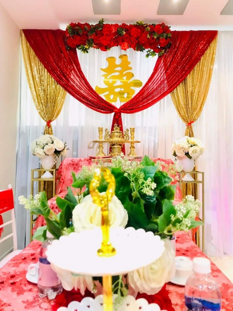 Việc trang trí bàn thờ gia tiên trong ngày cưới yêu cầu sự trang trọng và phải rực rỡ hơn. Ngoài các mâm quả, hương lư, bàn thờ gia tiên trong ngày cưới cũng cần có phông màn chữ “hỉ” to lớn và tươi sáng. Trên phông màn cũng cần có trang trí tên của cô dâu và chú rể để tôn vinh họ trong ngày trọng đại này.