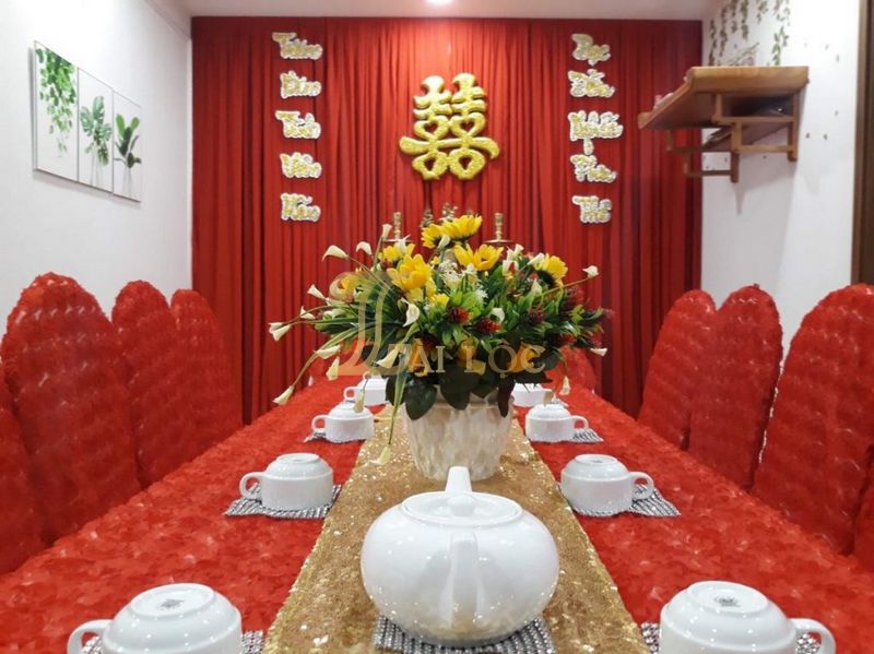 • Bàn thờ gia tiên: Bàn thờ tổ tiên cần được trang trí một cách tối giản nhưng không thể thiếu lễ hương, bát nhang, trái cây và hoa tươi cùng với chữ “hỷ” và câu đối màu đỏ rực rỡ.