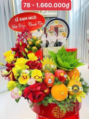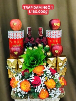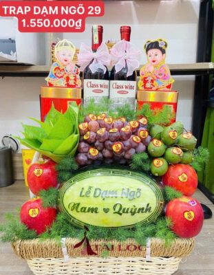 Để tráp dạm ngõ thêm phần sang trọng, nhà trai có thể chuẩn bị thêm một số loại hoa quả nhập khẩu như táo, nho, lê hàn, cam, xoài. Hãy chọn những quả tươi và có màu sắc nổi bật như vàng, đỏ để tráp lễ trông tươi tắn hơn nhé.